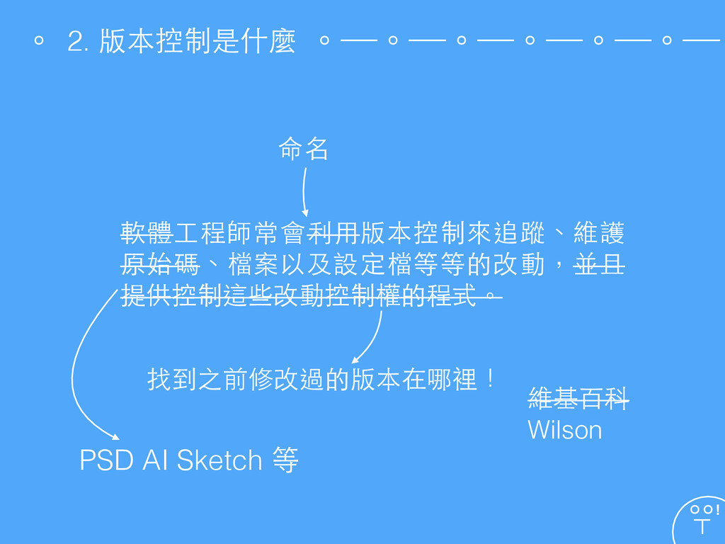 軟體⼯工程師常會利⽤用版本控制來追蹤、維護 原始碼、檔案以及設定檔等等的改動,並且 提供控制這些改動控制權的程式。 維基百科 Wilson 命名 PSD AI Sketch 等
