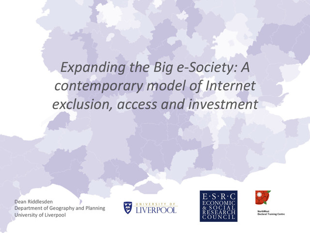 the Oxford Internet Ins<tute (OXII) every two years since 2003 • Aims to gather informa<on about Internet access, use and aftudes and the difference this makes for everyday life in Britain Issues: • Representa<ve sample, but small in size -‐ 2660 respondents across 260 Output Areas (OAs) • Need to es<mate data for all OAs in England Response: • Small Area Es<ma<on/ Imputa<on techniques • QUEST decision tree models • Predicted rates for 41 OXIS ques<ons based on Age, NS-‐SeC, and measures of rurality. (Gender, GOR poor predictors)
