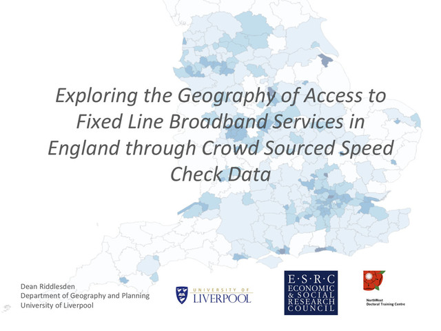 high speed broadband has become increasingly important in recent years • Universal Service Commitment (introduced 2010) aimed to deliver a minimum connec<on speed of 2 Mbps to every household in the UK by 2012 • Government are keen to get everybody online – jus<fied by key economic advantages and increased compe<<veness • Outside of government and Ofcom reports there have been few academic projects that aNempt to analyse the socio-‐spa<al structure of broadband access • There have been none that use crowd-‐sourced speed test data as a proxy for access and speed