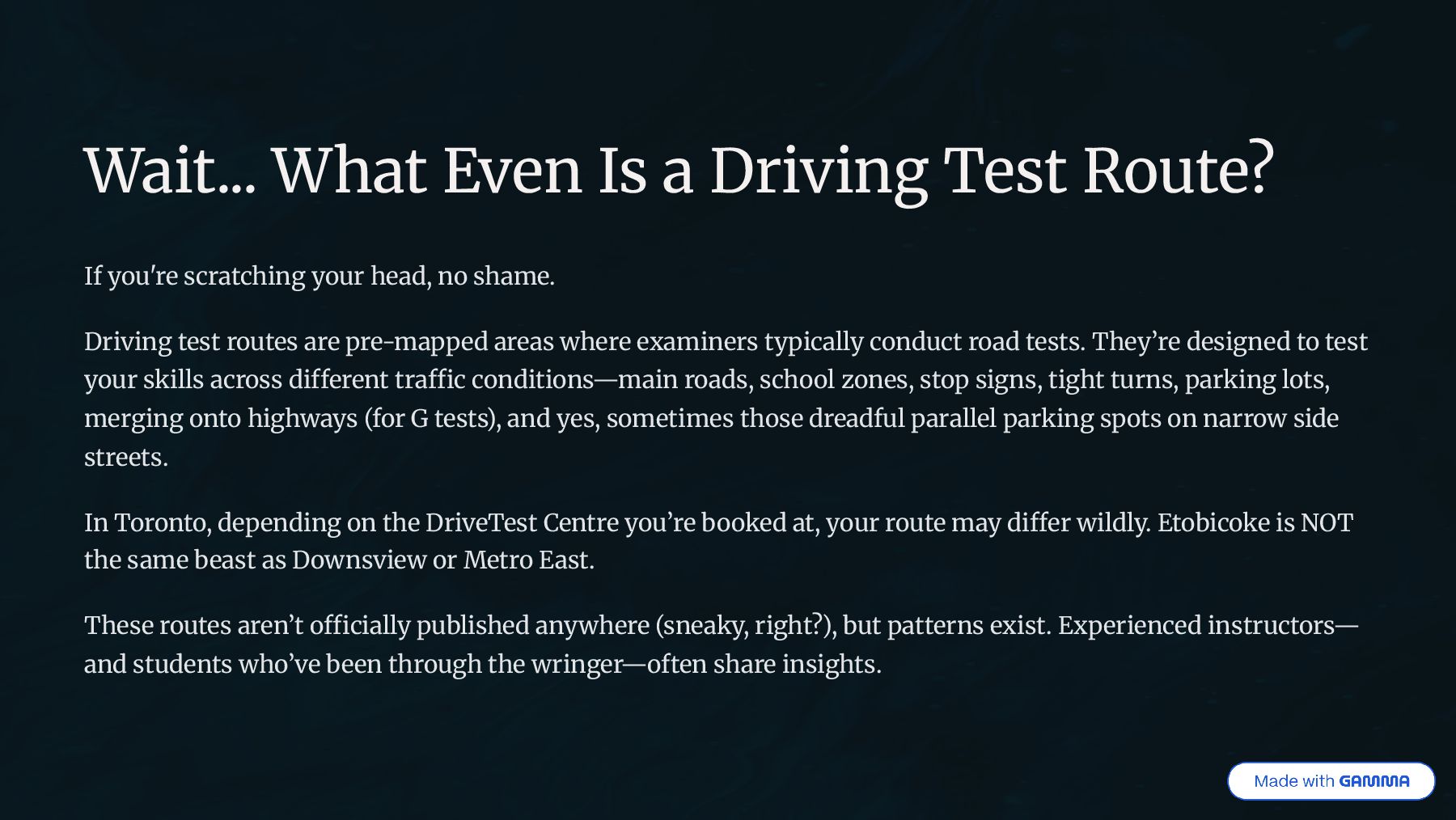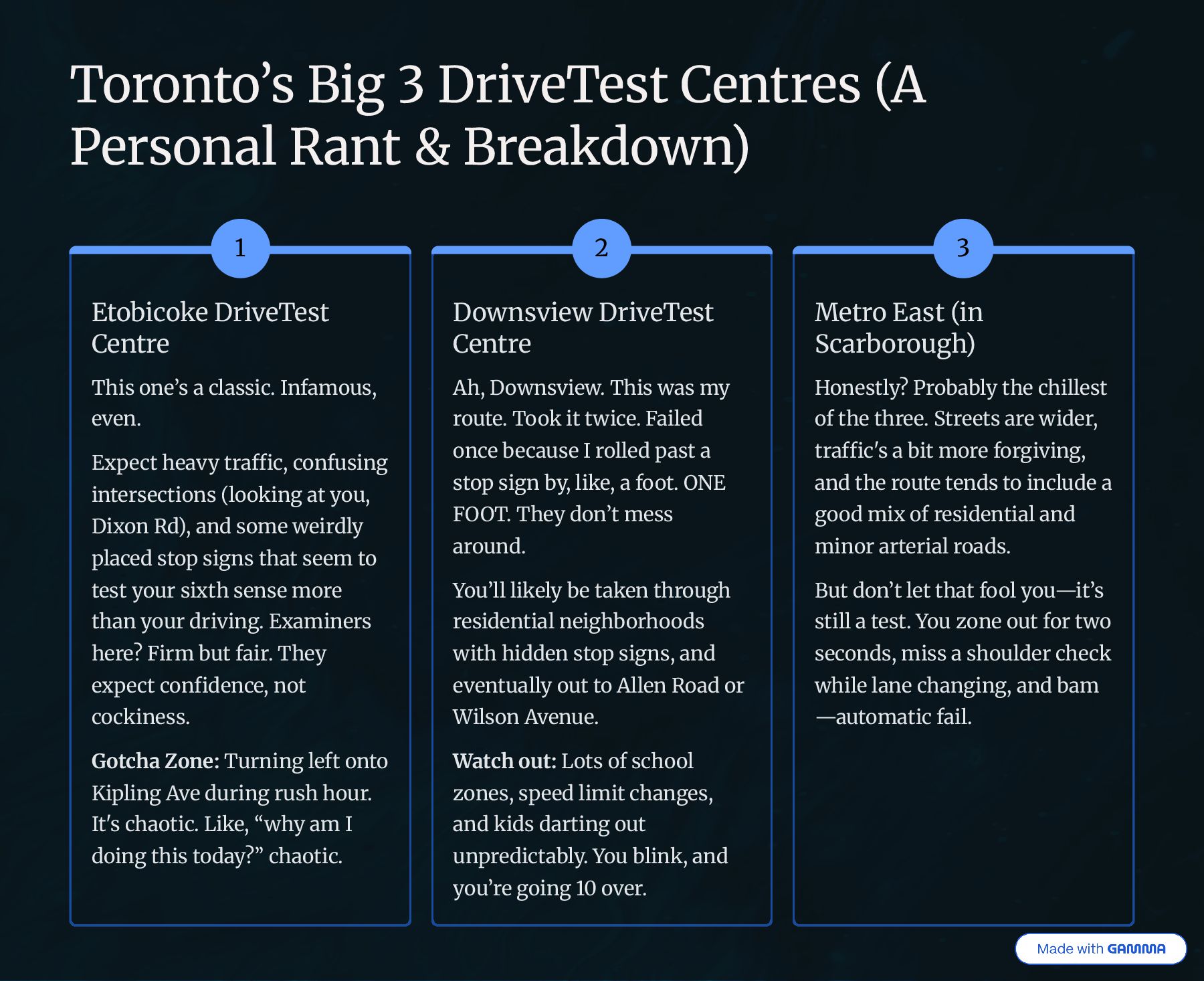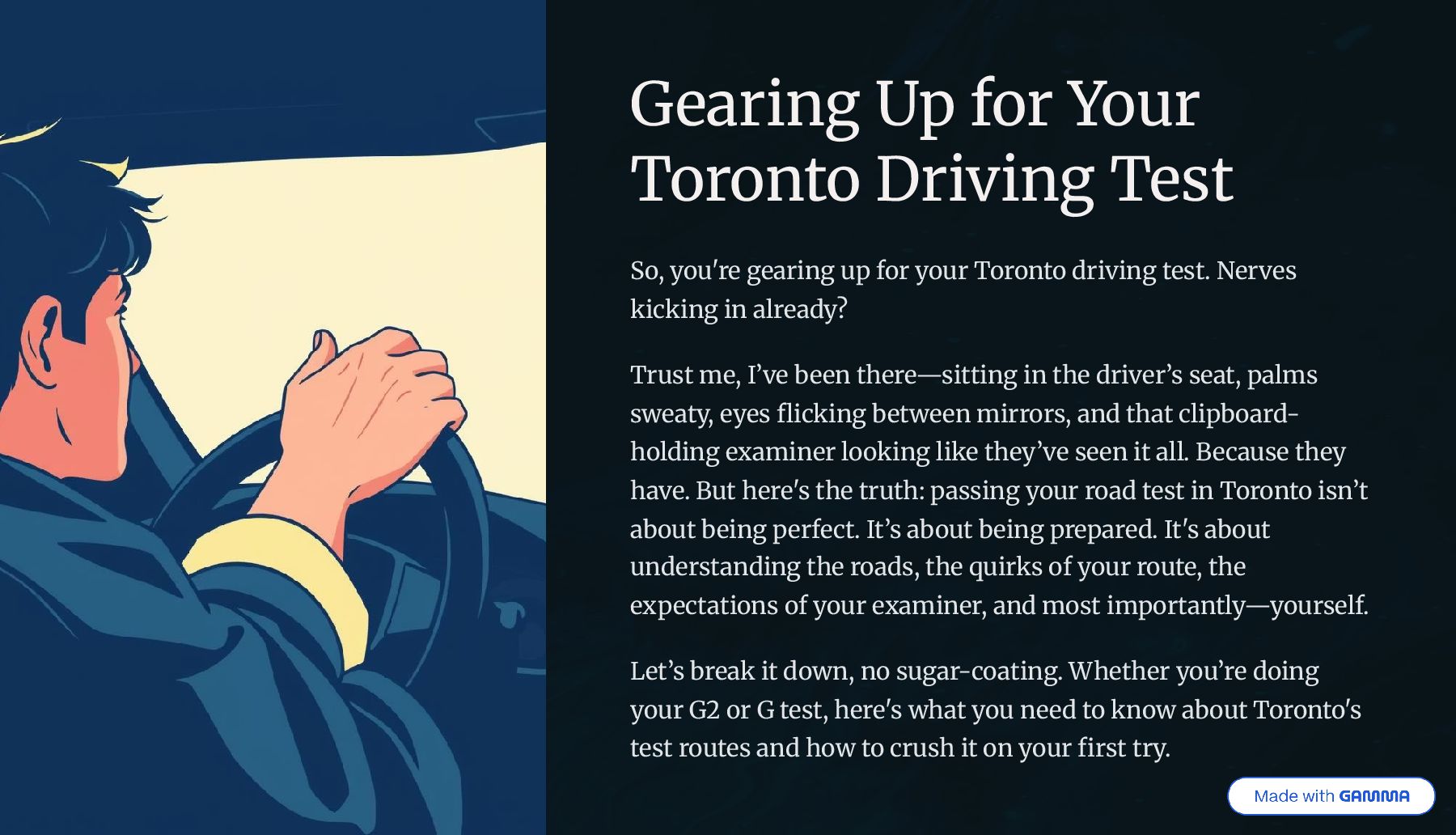 This article is a personal, detailed guide to Toronto driving test routes, what to expect, and how to prepare—covering popular test centres like Etobicoke, Downsview, and Metro East. It includes firsthand tips, route quirks, examiner insights, and practical advice for both G2 and G tests. It also highlights the importance of local practice, using experienced instructors, and choosing an