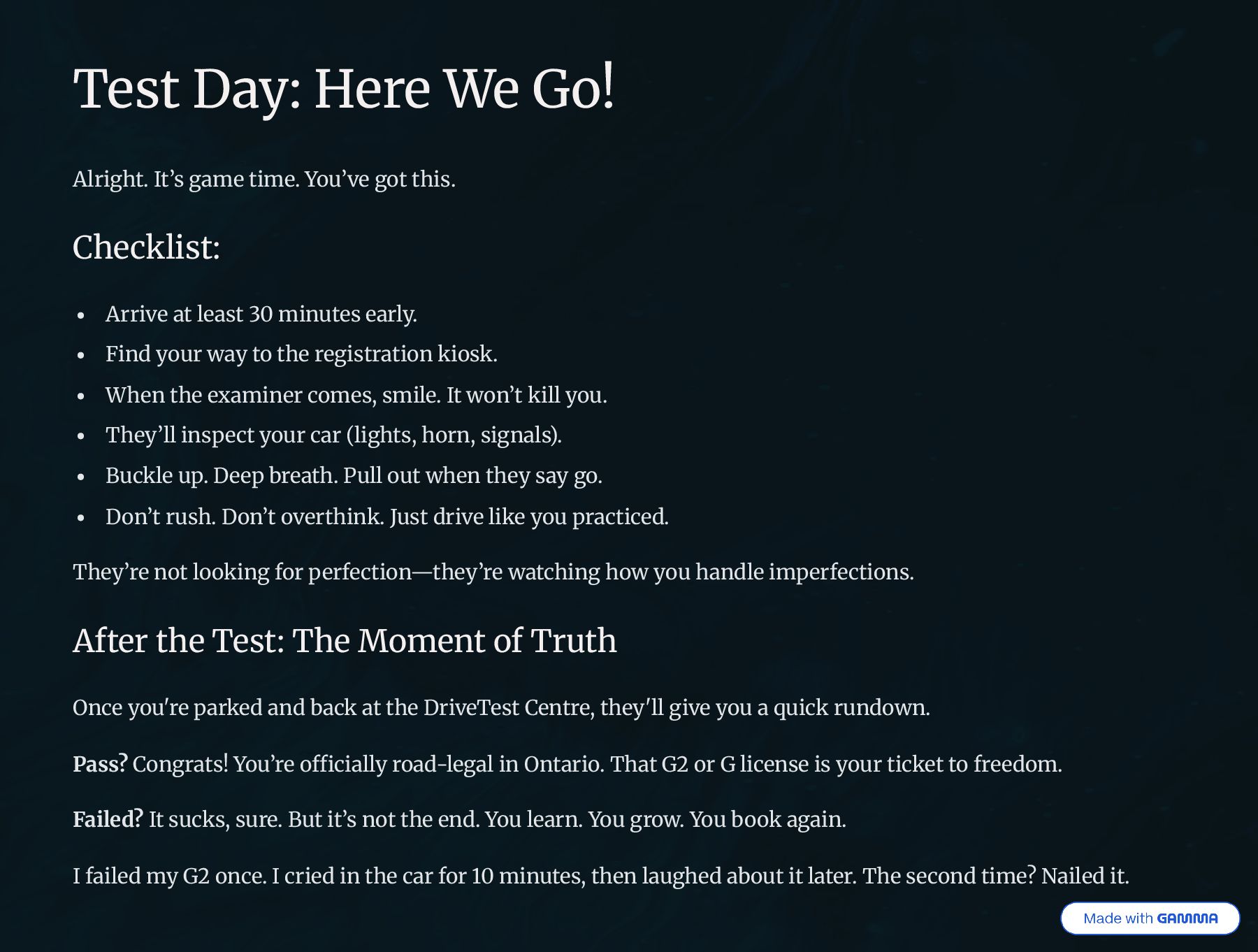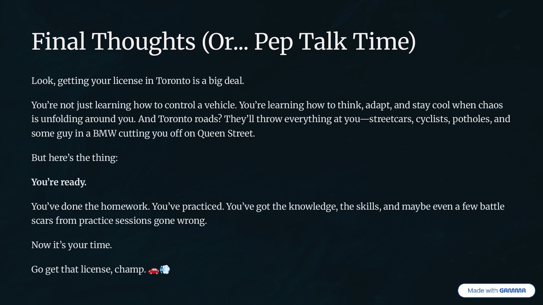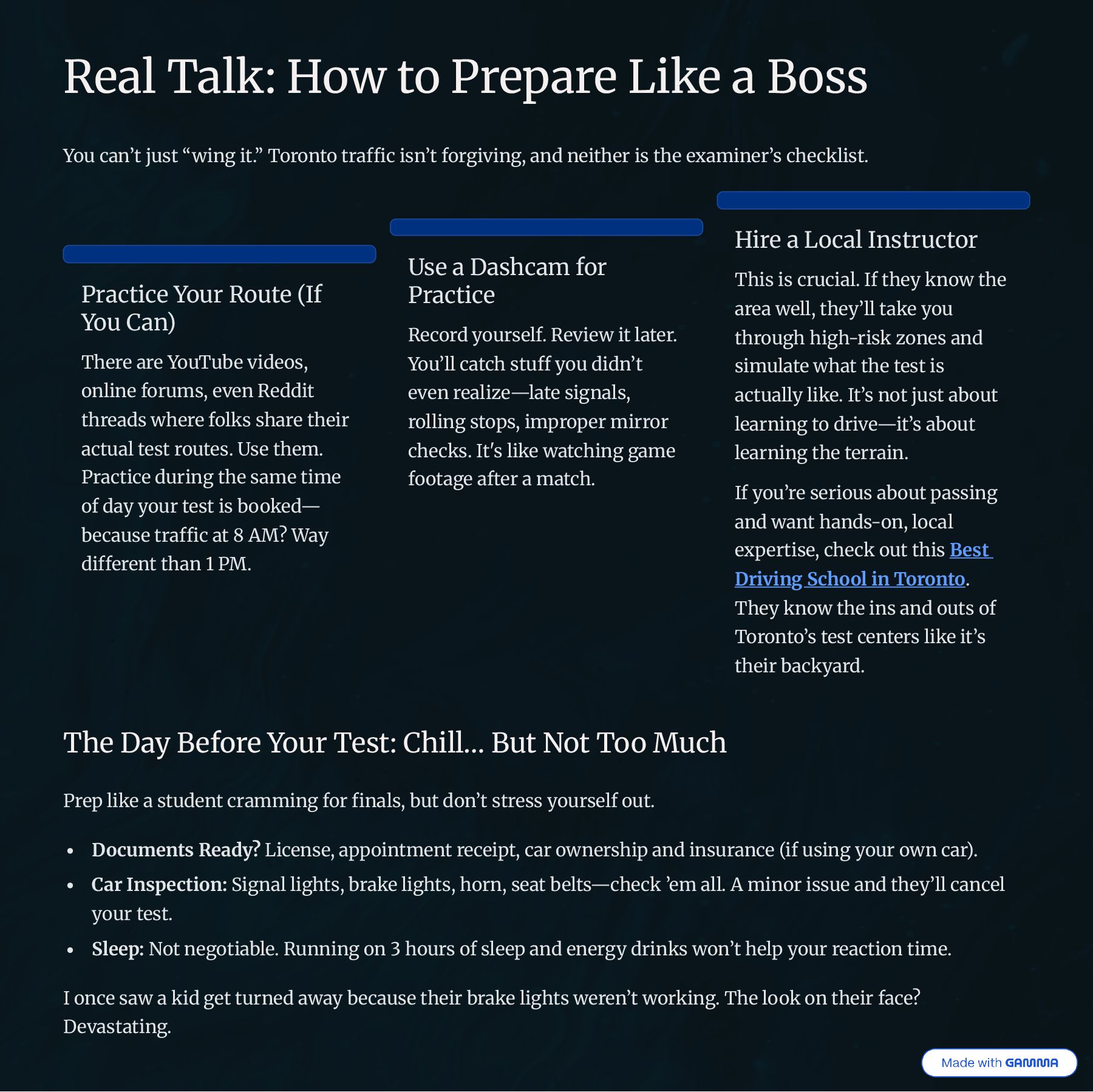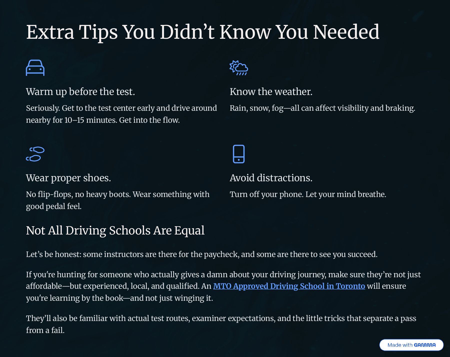 Best Driving School in Toronto to increase your chances of passing. With a conversational tone, real anecdotes, and street-smart strategies, it’s designed to help new drivers feel confident, not overwhelmed.