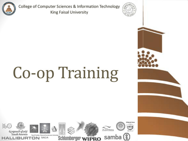 This presentation was conducted to provide an overview of the coop training process to the students at College of Computer Sciences and IT, King Faisal University.