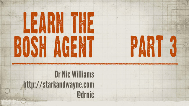 If you want to learn about bosh, then you'll want to learn about the bosh agent - it is how every server/instance is controlled by the bosh director. This part 3 of a 3 part short series into the inner workings of bosh from the perspective of the bosh agent itself.
