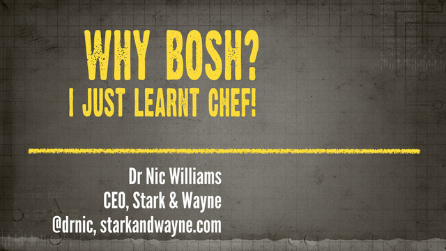 LEARNT CHEF | CLOUDTECH4 APRIL 2013 gem install bosh-‐bootstrap bosh-‐bootstrap deploy bosh-‐bootstrap ssh bosh cf prepare system demo bosh cf change deas 3 bosh cf add service postgresql 2 bosh cf add service redis 1 bosh deploy Try this: