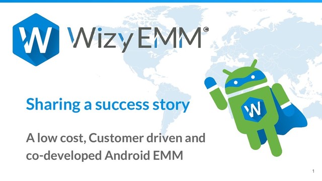 2017 August 2017 GO LIVE Onboarding of 5000 devices over 3 weeks. Support Start Proof of concept Demonstrate the ability to take control over a device remotely with 3 features Start Project Android AOSP No FCM New scopes Android GMS, device owner FCM Restart the project from scratch Solution delivery One month testing on site Continuous integration 2nd version Onboarding of 1000 devices more Total 6000 devices Android Enterprise Partnership WizyEMM public solution October 2017 January 2018