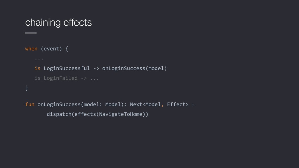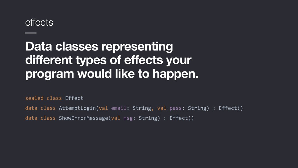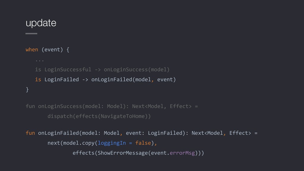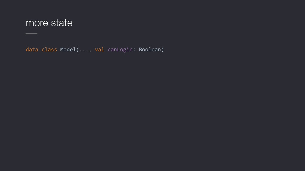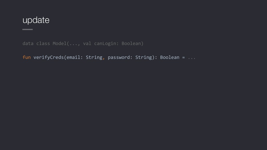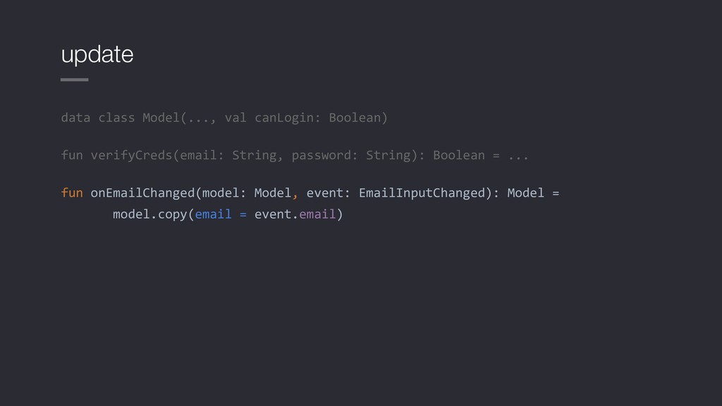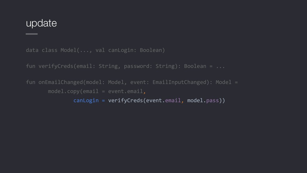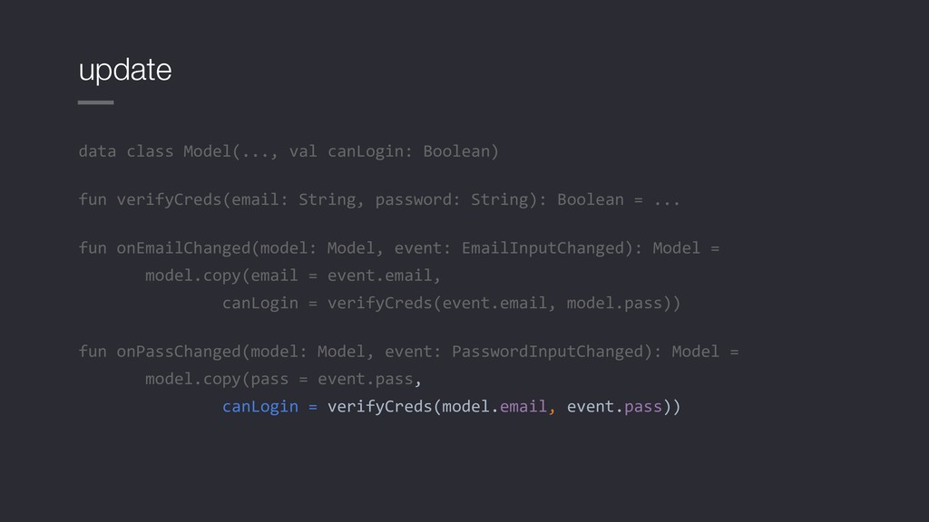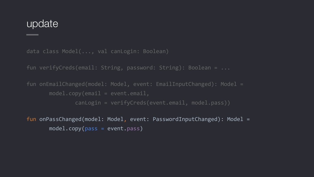 ... fun onEmailChanged(model: Model, event: EmailInputChanged): Next<Model, Effect> = next(model.copy(email = event.email, canLogin = verifyCreds(event.email, model.password))) fun onPassChanged(model: Model, event: PasswordInputChanged): Next<Model, Effect> = next(model.copy(pass = event.password, canLogin = verifyCreds(model.email, event.password)))