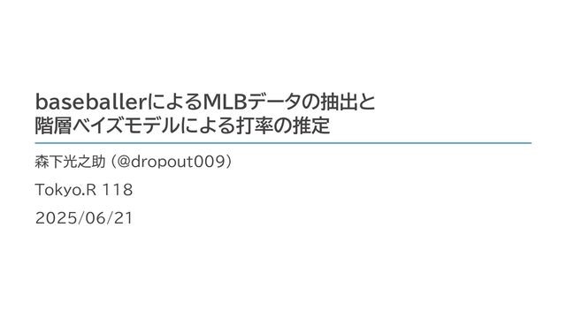 <- df_total |> # 初期時点と最終時点のデータを結合 select(Name, PA, AB, H, BA) |> filter(PA >= 502) |> # 規定打席以上の選手に限定 inner_join( df_initial |> select(Name, PA, AB, H, BA), by = c("Name"), suffix = c("_tot", "_ini") ) |> mutate(BA_mean = mean(BA_ini)) df # A tibble: 128 × 10 Name PA_tot AB_tot H_tot BA_tot PA_ini AB_ini H_ini BA_ini BA_mean <chr> <dbl> <dbl> <dbl> <dbl> <dbl> <dbl> <dbl> <dbl> <dbl> 1 Jarren Duran 732 668 190 0.284 142 127 34 0.268 0.257 2 Shohei Ohtani 731 636 197 0.31 149 131 44 0.336 0.257 3 Gunnar Henderson 719 630 177 0.281 132 117 34 0.291 0.257 4 Marcus Semien 718 650 154 0.237 135 124 32 0.258 0.257 5 Juan Soto 713 576 166 0.288 144 117 38 0.325 0.257 分析用データの作成と確認 11
