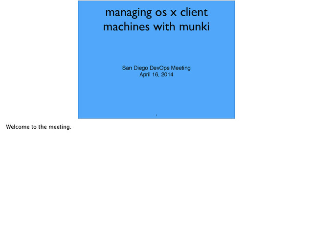 that can be used to manage software installs (and removals) on OS X client machines. Differences between munki and ‘configuration management’ like chef. Set it and forget it - munki sets it’s clients to a certain state, and then leaves them be, where chef runs on a regular basis to enforce things. Apple software updates can come from Apple directly, or they can come from a local cache (reposado/apple sus). Common software deployment (mostly .apps, but .pkgs are common as well).