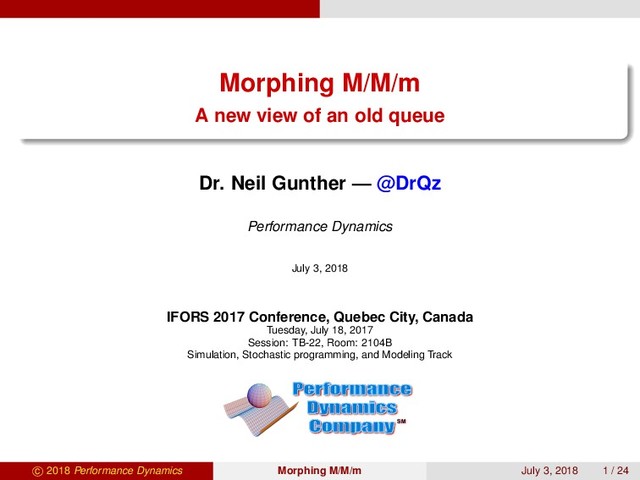 = S + S m(1 − ρ) C(m, a) (5) where C(m, a) was published 1 by Agner Erlang exactly 100 years ago C(m, a) = am m!(1 − ρ) m−1 k=0 ak k! + am m!(1 − ρ) (6) a = mρ is the (telephonic) traffic intensity measured in Erlangs Arnold Allen: “Solving (6) is an unnatural act” Can code an algorithm but all intuition is lost 1Tore O. Engset published later c 2018 Performance Dynamics Morphing M/M/m July 3, 2018 9 / 24
