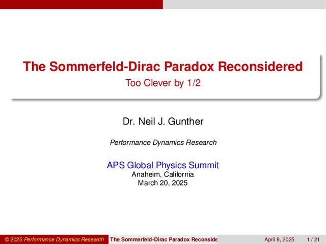 and Interpretation of Certain Invariants as Group Generators in Quantum Mechanics, M.Sc., La Trobe University, Submitted to the Dept. of Applied Mathematics (1976) [2] N.J. Gunther, “Dynamical Symmetry Breaking in The Lewis-Riesenfeld Oscillator”, J. Math.Phys. (21)7, 286 (1980) [3] P.G. Bergmann, Introduction to the Theory of Relativity, Dover 1976 (Orig. pub. 1942) [4] H.A. Bethe and E.E. Salpeter, Quantum Mechanics of One- and Two-Electron Atoms, Springer-Verlag (1957) [5] W. Heisenberg, “Ausstrahlung von Sommerfelds Werk in der Gegenwart,” Physikalische Bl¨ atter, 24 530-537 (1968) [6] L.C. Biedenharn, “The ‘Sommerfeld Puzzle’ Revisited and Resolved,” Foundations of Physics, vol. 13, no. 1 (1983) [7] S. Weinberg, The Quantum Theory of Fields, Vol. 1: Foundations, Cambridge Univ. Press (1995) [8] Y. Granovskii, “Sommerfeld Formula and Dirac’s Theory,” Uspekhi Fiz. Nauk, 47(5), 523-524 (2004) [9] M. Born, Mechanics of the Atom, Ungar, 1960 (Orig. German 1924), [10] N. Bohr, “On the constitution of atoms and molecules,” The London, Edinburgh and Dublin Philosophical Magazine and Journal of Science, 26 (151): 1-25 (July 1913) [11] A. Sommerfeld, Atombau und Spektrallinien, Friedrich Vieweg und Sohn, Braunschweig (1919) [12] R.P. Feynman, “Quantum Electrodynamics,” W.A. Benjamin (1973) © 2025 Performance Dynamics Research The Sommerfeld-Dirac Paradox Reconsidered April 8, 2025 20 / 21