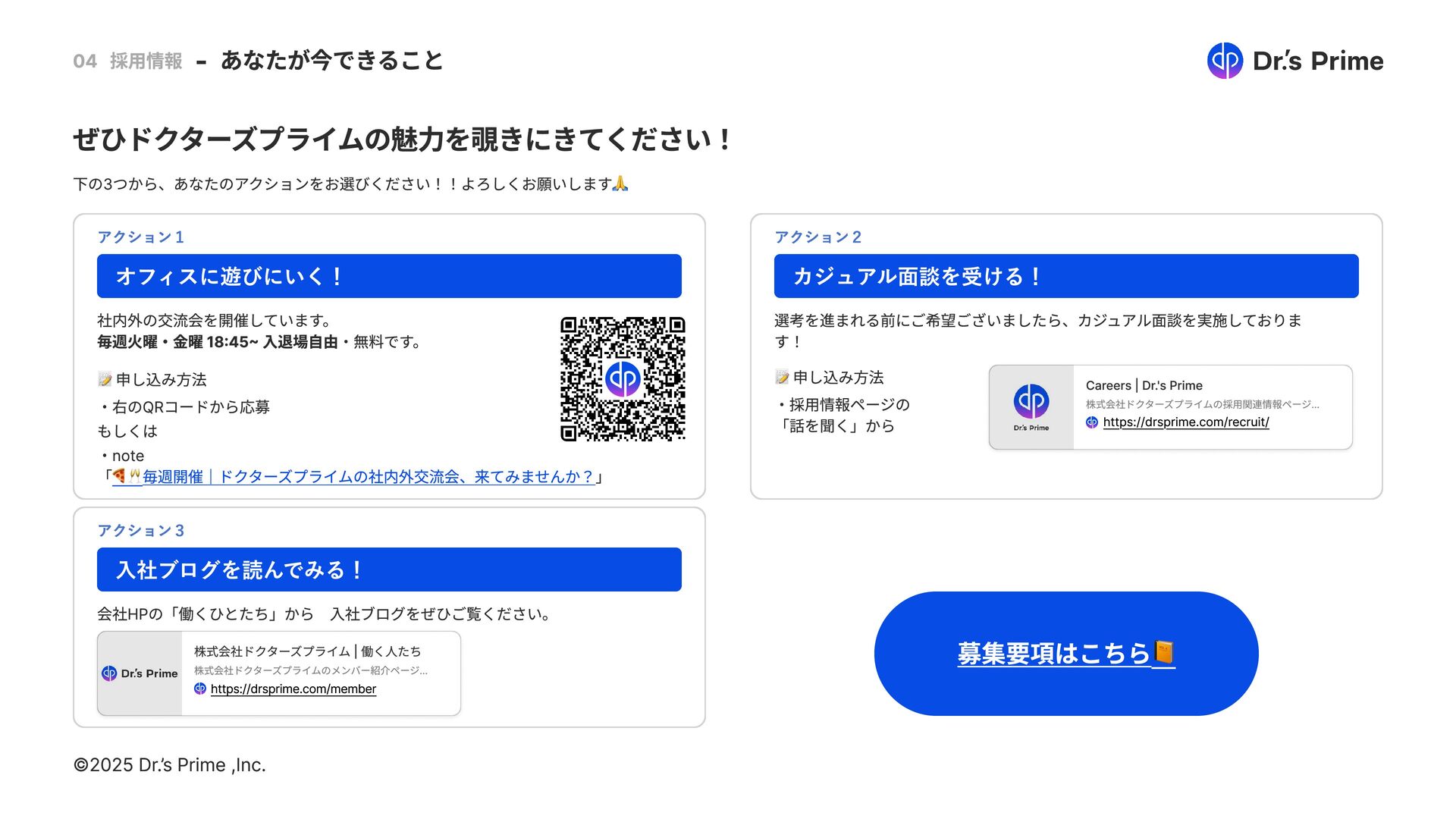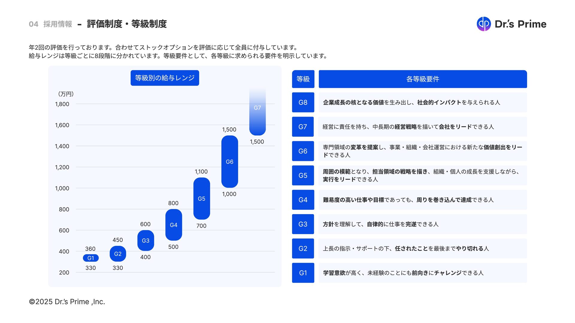 (万円) 1,800 1,600 1,400 1,200 1,000 800 600 400 200 等級別の給与レンジ G1 G2 G3 G4 G5 G6 G7 330 330 400 500 700 1,000 1,500 360 450 600 800 1,100 1,500 等級 各等級要件 G8 企業成長の核となる価値を生み出し、社会的インパクトを与えられる人 G7 経営に責任を持ち、中長期の経営戦略を描いて会社をリードできる人 G6 専門領域の変革を提案し、事業・組織・会社運営における新たな価値創出をリー ドできる人 G5 周囲の模範となり、担当領域の戦略を描き、組織・個人の成長を支援しながら、 実行をリードできる人 G4 難易度の高い仕事や目標であっても、周りを巻き込んで達成できる人 G3 方針を理解して、自律的に仕事を完遂できる人 G2 上長の指示・サポートの下、任されたことを最後までやり切れる人 G1 学習意欲が高く、未経験のことにも前向きにチャレンジできる人