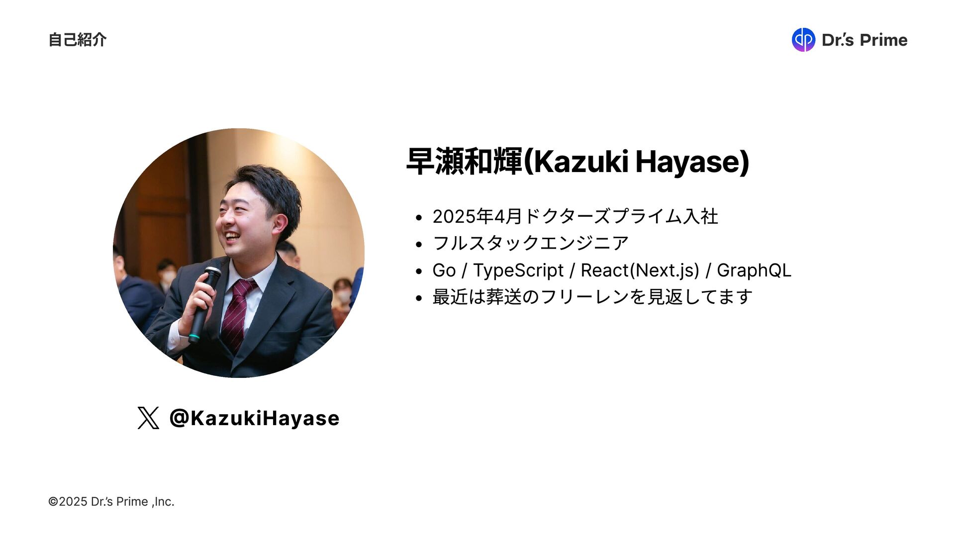 株式会社ドクターズプライム エンジニアリングマネージャー。株式会社STADIUMでGo/TypeScriptを用いた開発リードを経て、2023年11月にドクターズプライム入社。