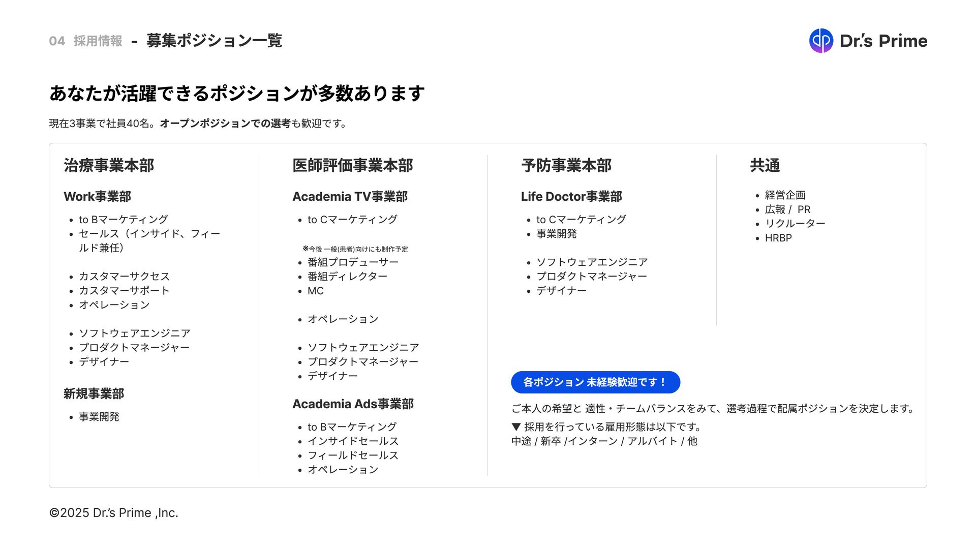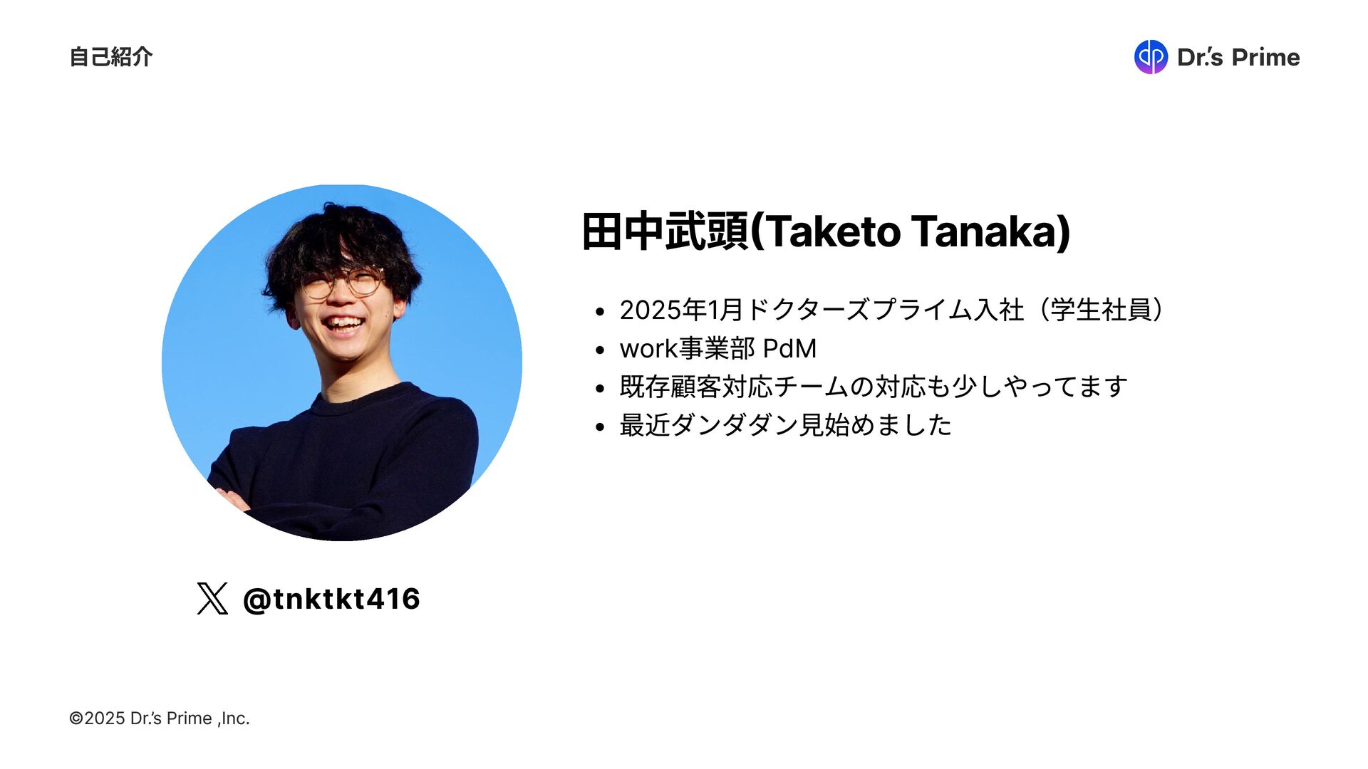 2023年にドクターズプライムへインターン入社し、Work事業部でCSとして顧客サポートに従事。2025年からは学生社員として同事業部でPdMを担当し、医師向け求人サービスの開発や改善に取り組み、CSとPdMの両面からサービス改善に取り組んでいる。