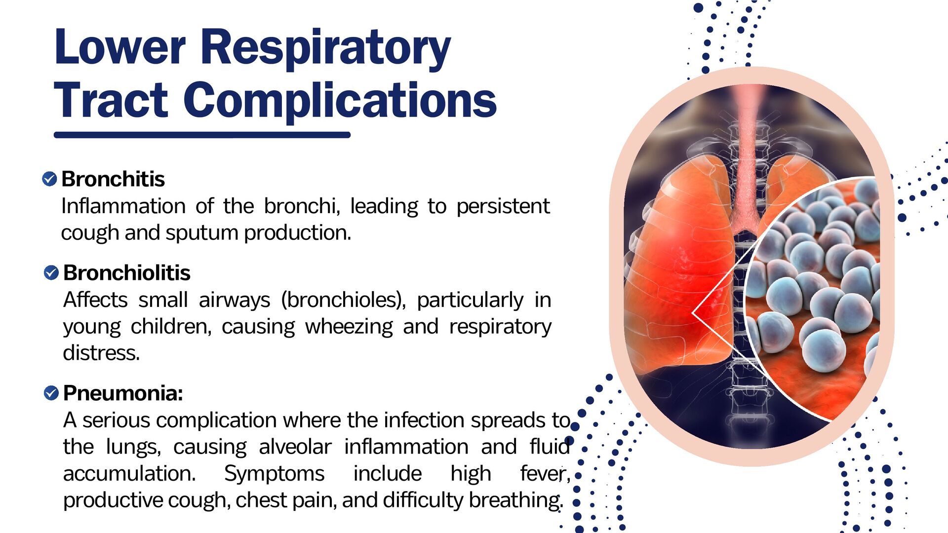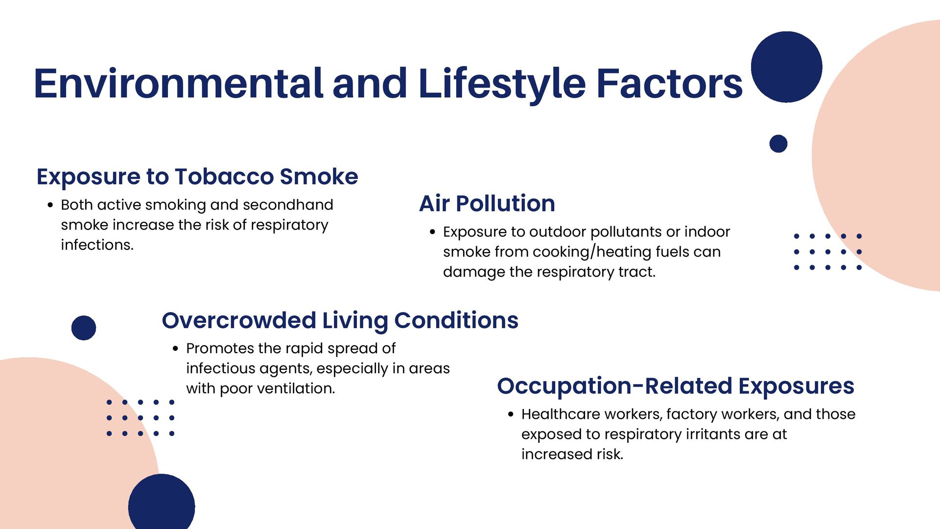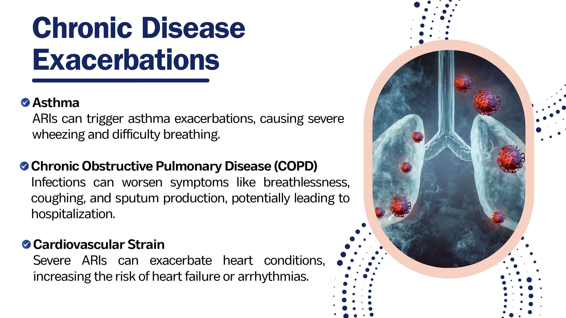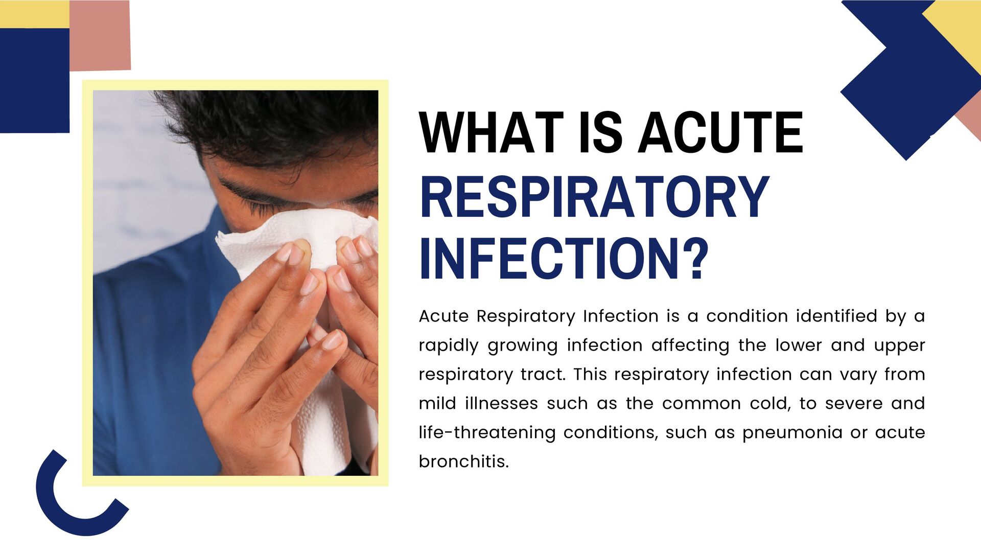Acute respiratory infections (ARIs) affect the airways, making breathing difficult. Common symptoms include cough, fever, sore throat, congestion, and shortness of breath. ARIs can be caused by viruses (like influenza and COVID-19) or bacteria (such as pneumonia). Risk factors include a weak immune system, pollution, and smoking. Diagnosis involves physical examination, chest X-rays, and lab tests.