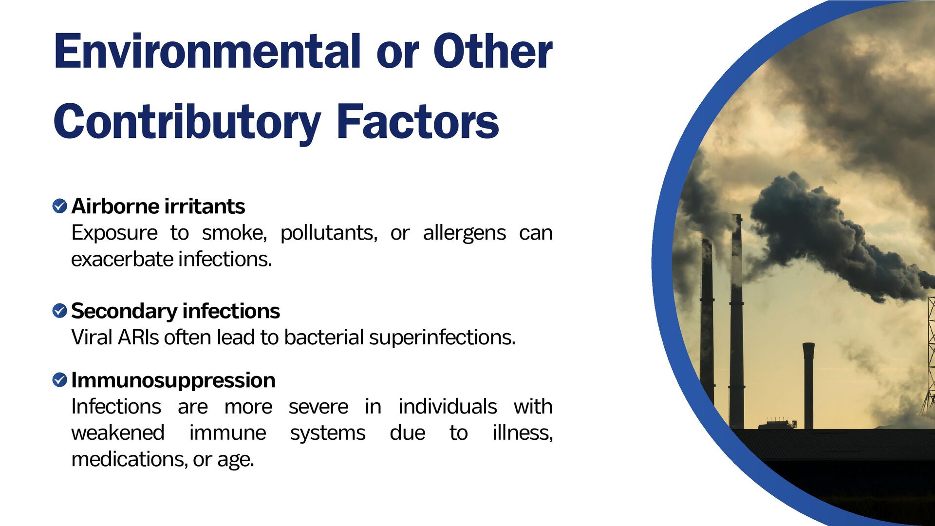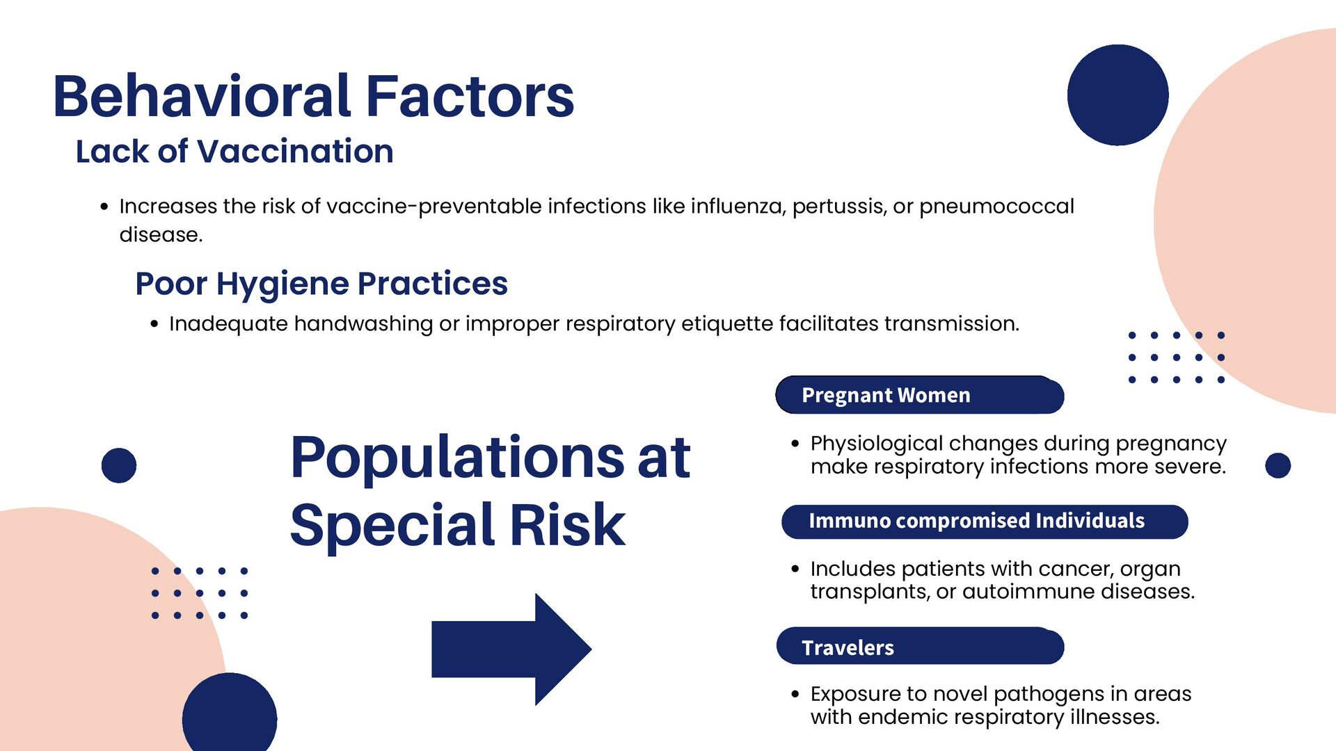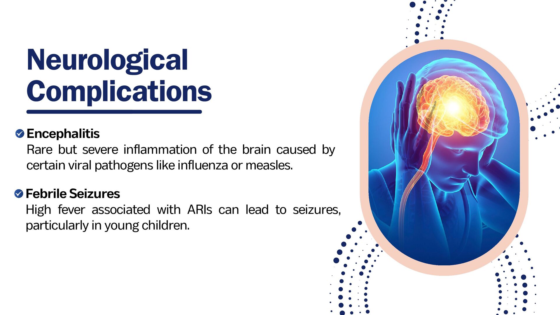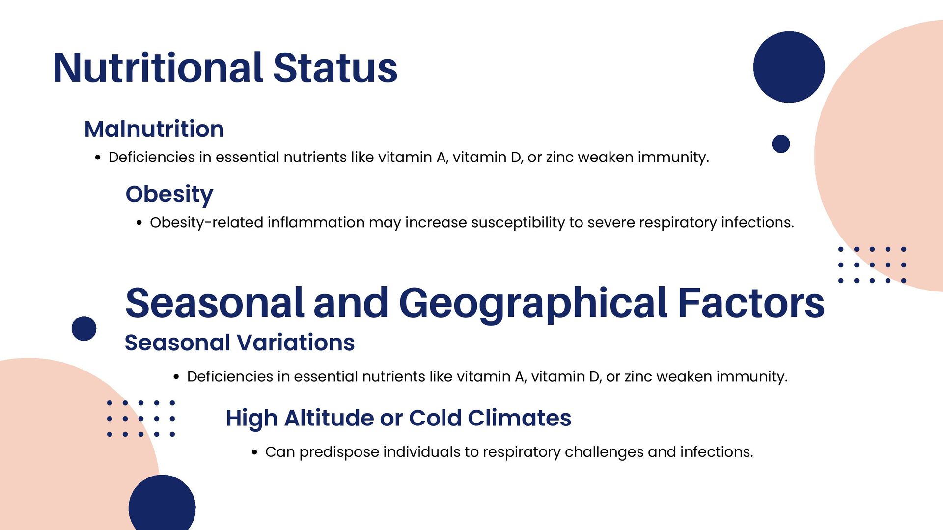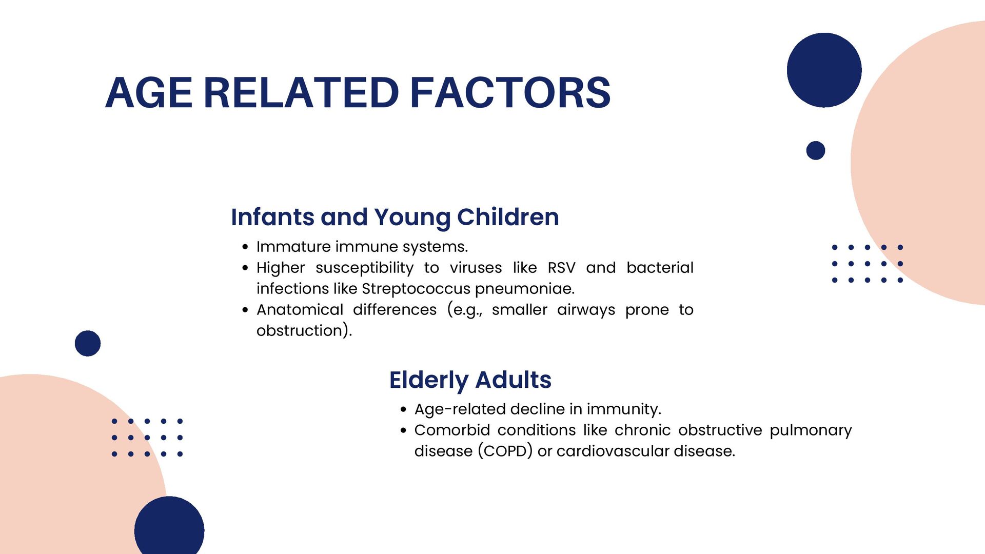 Acute respiratory infections (ARIs) affect the airways, making breathing difficult. Common symptoms include cough, fever, sore throat, congestion, and shortness of breath. ARIs can be caused by viruses (like influenza and COVID-19) or bacteria (such as pneumonia). Risk factors include a weak immune system, pollution, and smoking. Diagnosis involves physical examination, chest X-rays, and lab tests.