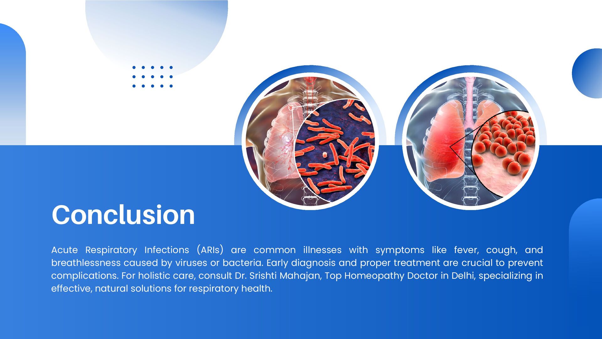 Treatment depends on the cause—viral infections often require rest and fluids, while bacterial infections may need antibiotics. Preventive measures include vaccination, hand hygiene, and avoiding exposure to infected individuals. Check out the PPT about Acute Respiratory Infection explaining its causes, symptoms, and other information by Dr. Srishti Mahajan one of the best homeopathic doctor in Delhi NCR.