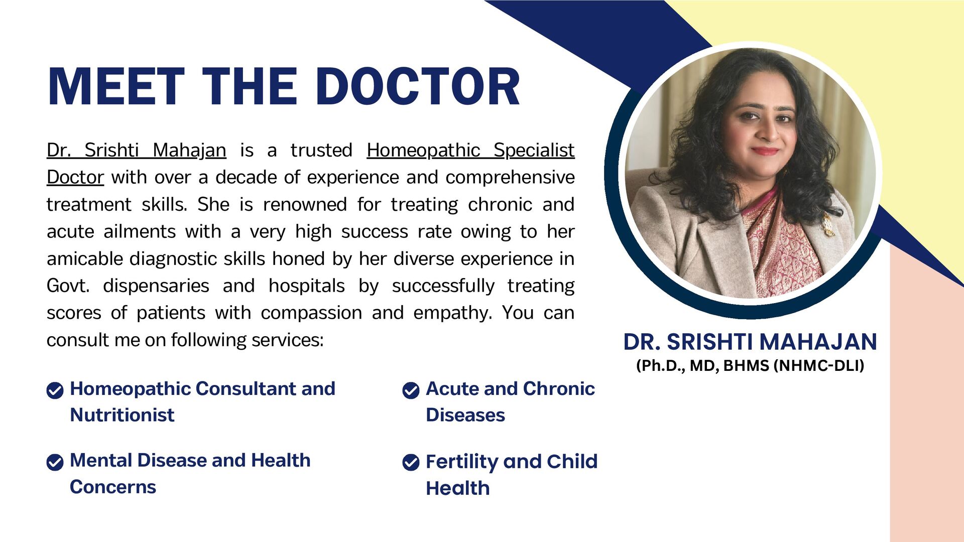 If you are searching for the best homeopathy doctor near me then don't forget to consider Dr. Srishti Mahajan who is an ACE Certified Dietician and Nutritionist and also a renowned Homeopathy Doctor.