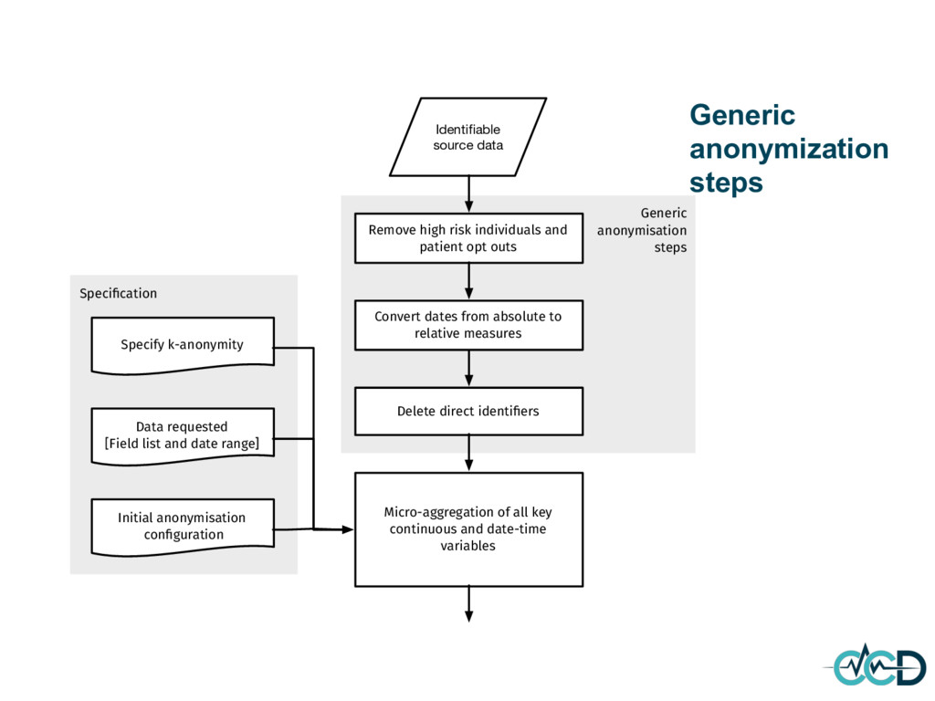 Delete direct identifiers Convert dates from absolute to relative measures Remove high risk individuals and patient opt outs Specify k-anonymity Data requested [Field list and date range] Micro-aggregation of all key continuous and date-time variables Initial anonymisation configuration