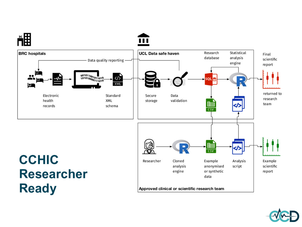 BRC hospitals Secure storage Researcher Electronic health records Standard XML schema Research database Statistical analysis engine Final scientific report Data quality reporting Data validation Cloned analysis engine Example anonymised or synthetic data Analysis script Example scientific report returned to research team CCHIC Researcher Ready
