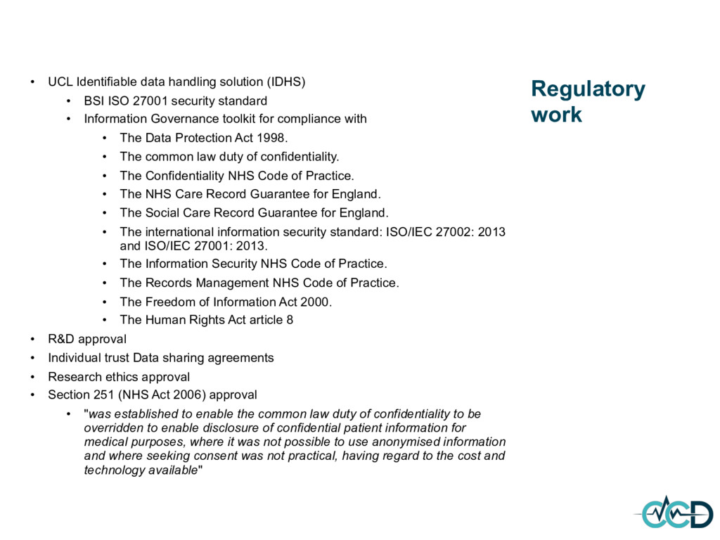 BSI ISO 27001 security standard • Information Governance toolkit for compliance with • The Data Protection Act 1998. • The common law duty of confidentiality. • The Confidentiality NHS Code of Practice. • The NHS Care Record Guarantee for England. • The Social Care Record Guarantee for England. • The international information security standard: ISO/IEC 27002: 2013 and ISO/IEC 27001: 2013. • The Information Security NHS Code of Practice. • The Records Management NHS Code of Practice. • The Freedom of Information Act 2000. • The Human Rights Act article 8 • R&D approval • Individual trust Data sharing agreements • Research ethics approval • Section 251 (NHS Act 2006) approval • "was established to enable the common law duty of confidentiality to be overridden to enable disclosure of confidential patient information for medical purposes, where it was not possible to use anonymised information and where seeking consent was not practical, having regard to the cost and technology available"