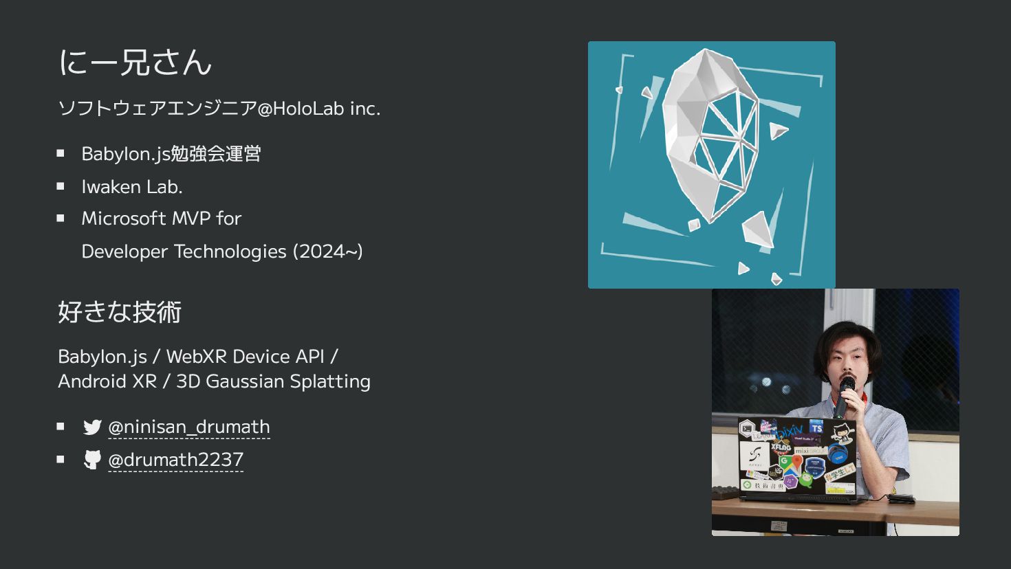 1. にー兄さん ソフトウェアエンジニア@HoloLab inc. Babylon.js勉強会運営 Iwaken Lab. Microsoft MVP for Developer