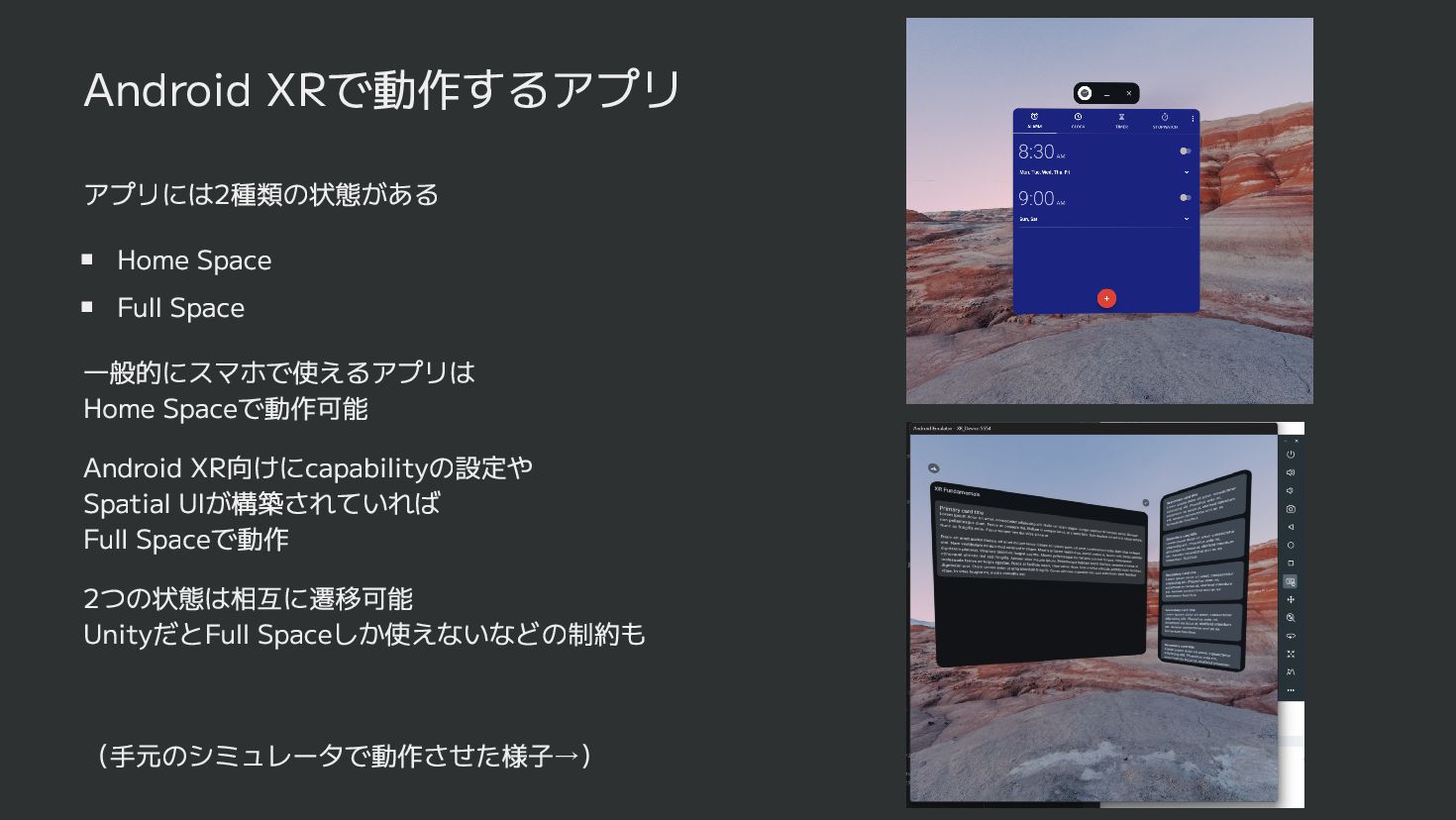Android XR向けにcapabilityの設定や Spatial UIが構築されていれば Full Spaceで動作 2つの状態は相互に遷移可能 UnityだとFull Spaceしか使えないなどの制約も (手元のシミュレータで動作させた様子→)