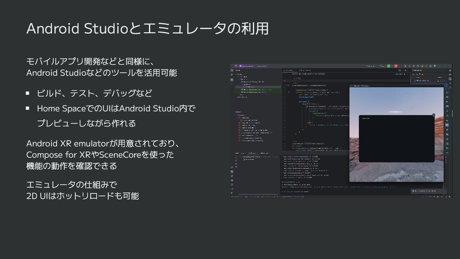 Android XR emulatorが用意されており、 Compose for XRやSceneCoreを使った 機能の動作を確認できる エミュレータの仕組みで 2D UIはホットリロードも可能