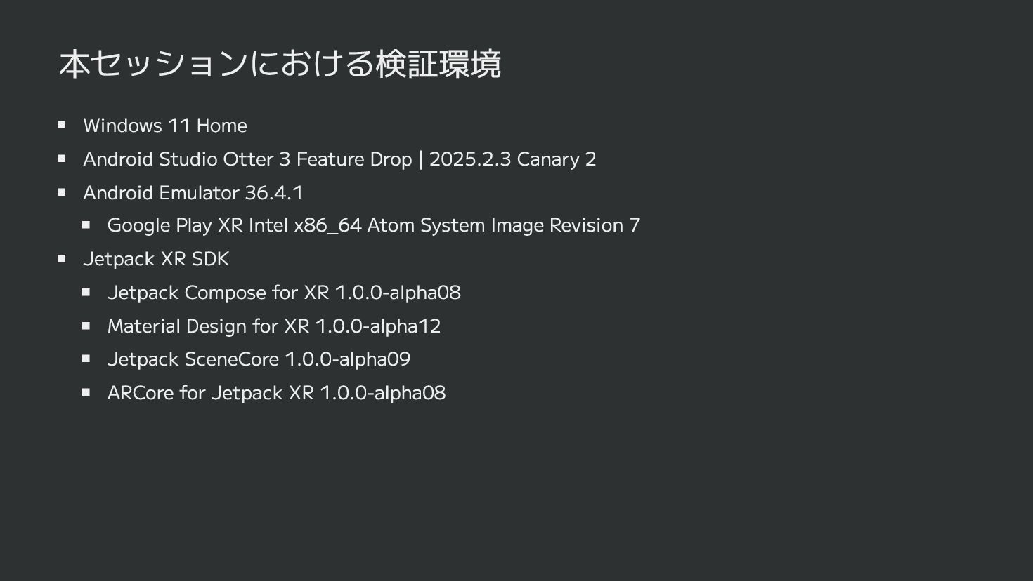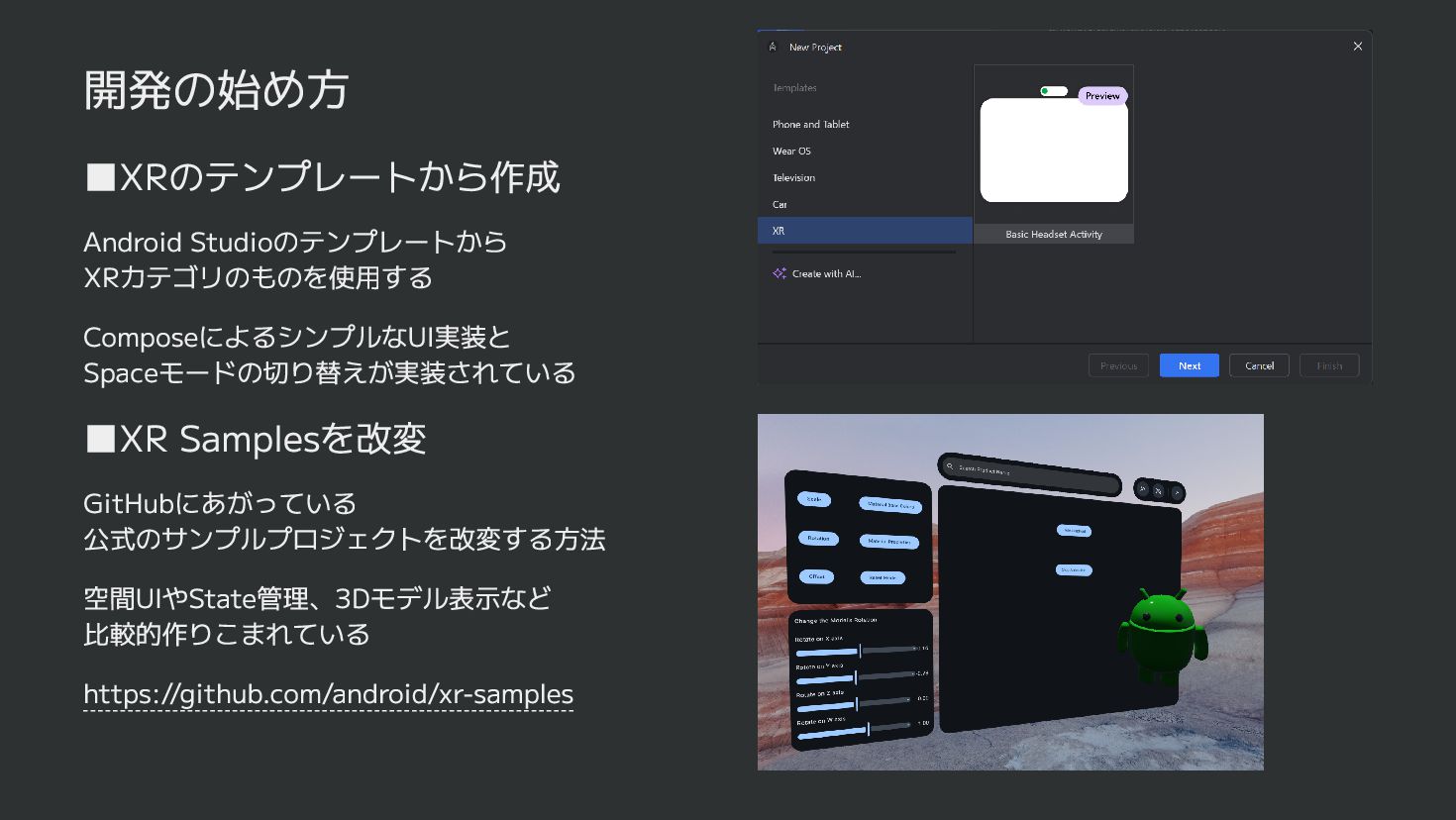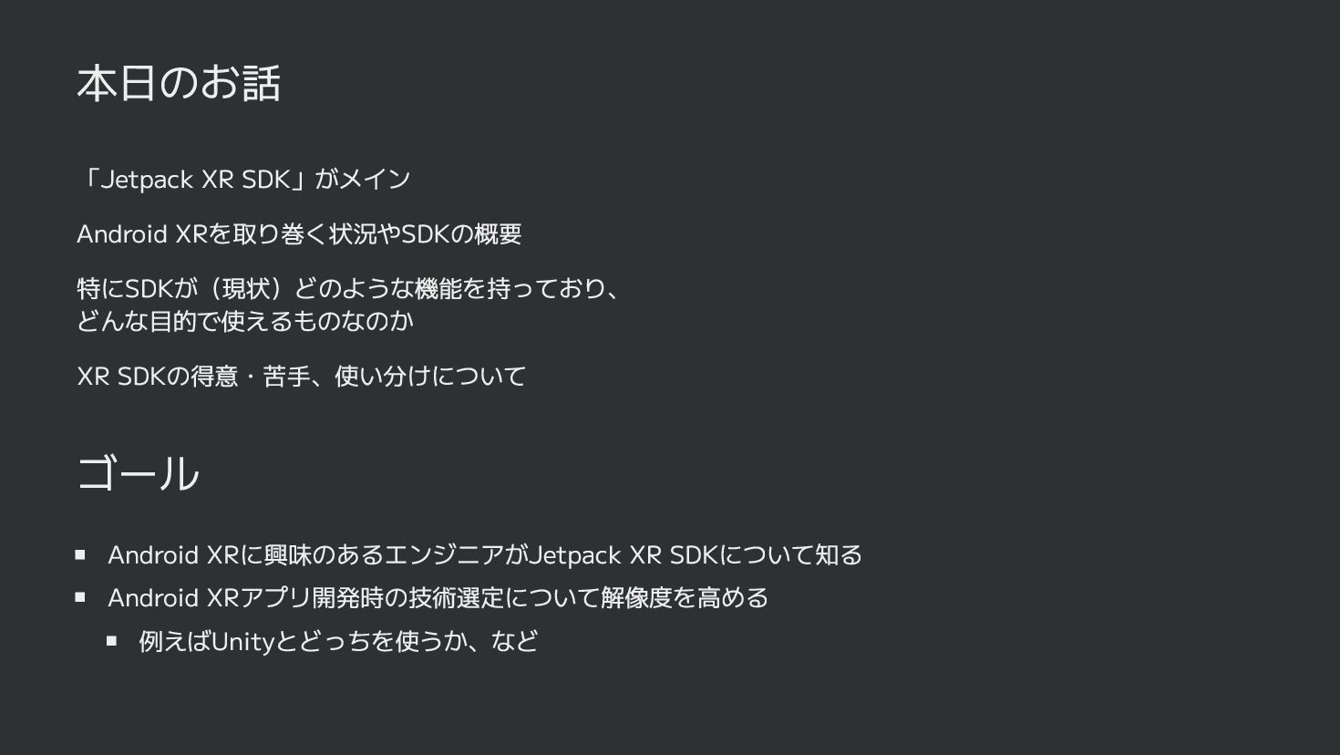 ゴール Android XRに興味のあるエンジニアがJetpack XR SDKについて知る Android XRアプリ開発時の技術選定について解像度を高める 例えばUnityとどっちを使うか、など