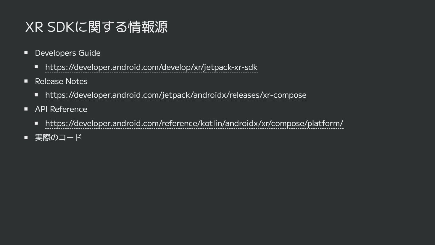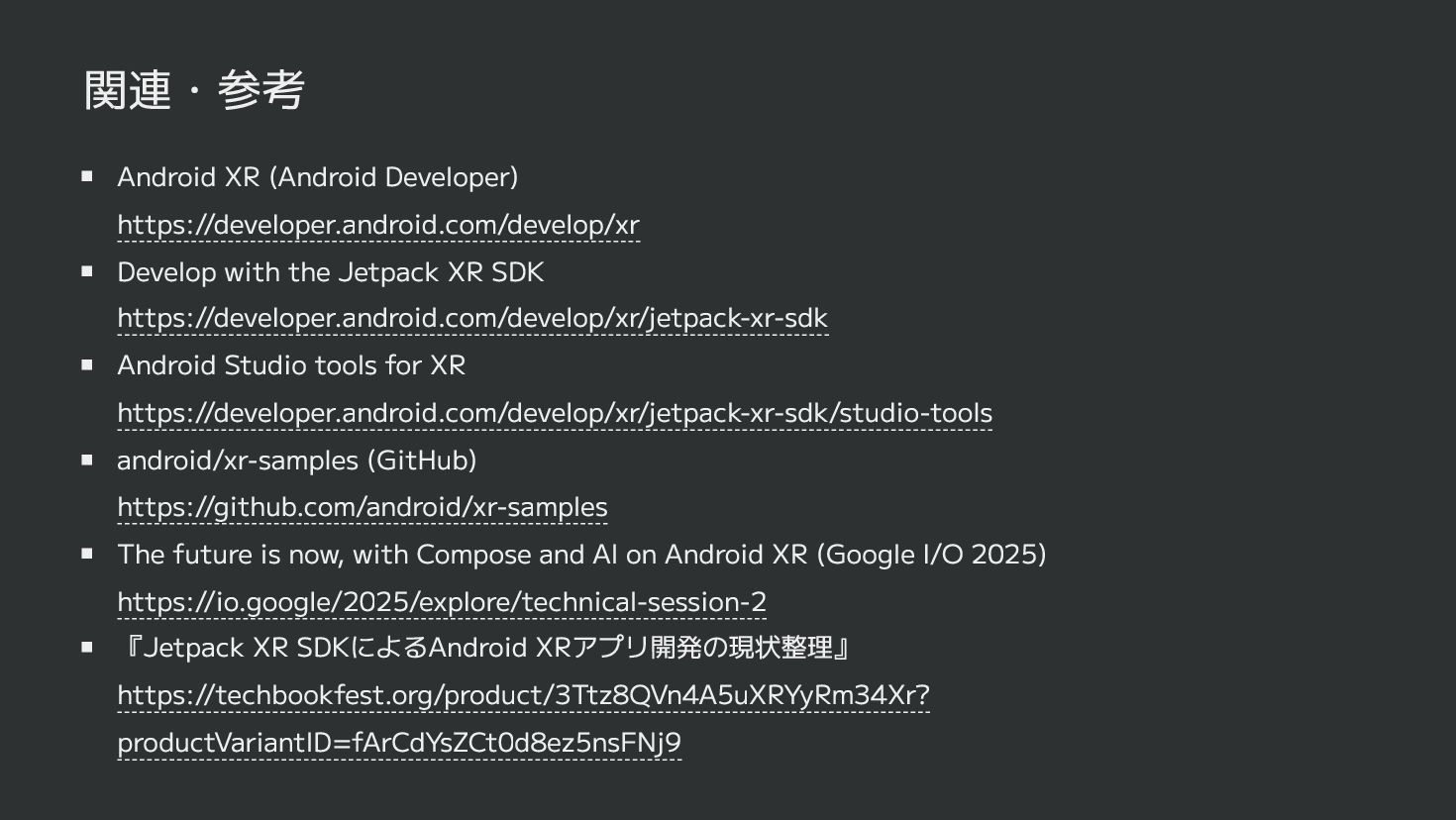 XR SDK https://developer.android.com/develop/xr/jetpack-xr-sdk Android Studio tools for XR https://developer.android.com/develop/xr/jetpack-xr-sdk/studio-tools android/xr-samples (GitHub) https://github.com/android/xr-samples The future is now, with Compose and AI on Android XR (Google I/O 2025) https://io.google/2025/explore/technical-session-2 『Jetpack XR SDKによるAndroid XRアプリ開発の現状整理』 https://techbookfest.org/product/3Ttz8QVn4A5uXRYyRm34Xr? productVariantID=fArCdYsZCt0d8ez5nsFNj9