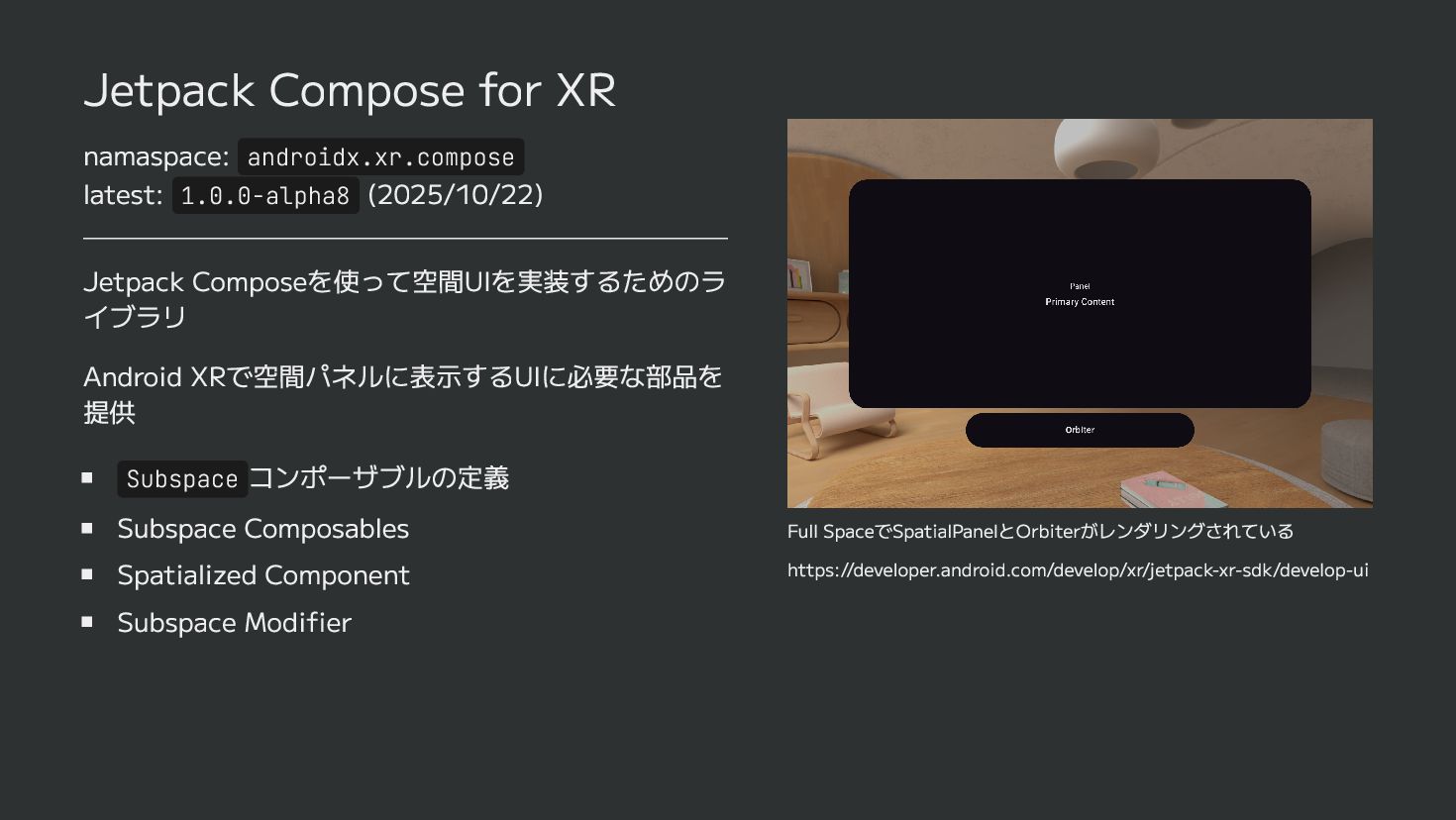 Composeを使って空間UIを実装するためのラ イブラリ Android XRで空間パネルに表示するUIに必要な部品を 提供 Subspace コンポーザブルの定義 Subspace Composables Spatialized Component Subspace Modifier Full SpaceでSpatialPanelとOrbiterがレンダリングされている https://developer.android.com/develop/xr/jetpack-xr-sdk/develop-ui