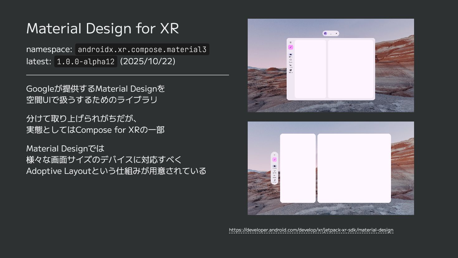 Designを 空間UIで扱うするためのライブラリ 分けて取り上げられがちだが、 実態としてはCompose for XRの一部 Material Designでは 様々な画面サイズのデバイスに対応すべく Adoptive Layoutという仕組みが用意されている https://developer.android.com/develop/xr/jetpack-xr-sdk/material-design