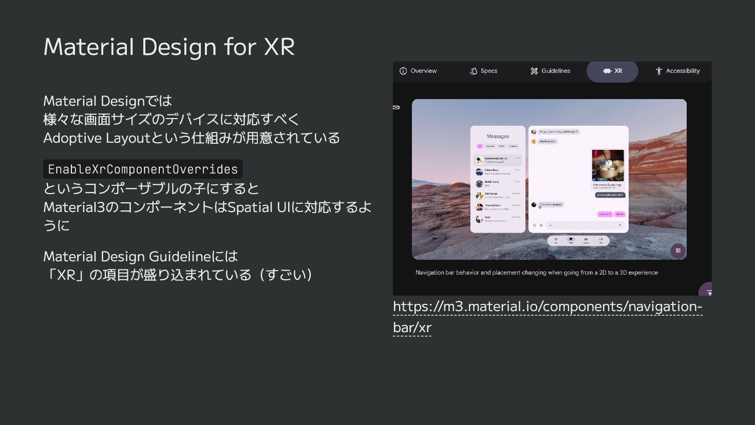 というコンポーザブルの子にすると Material3のコンポーネントはSpatial UIに対応するよ うに Material Design Guidelineには 「XR」の項目が盛り込まれている(すごい) https://m3.material.io/components/navigation- bar/xr