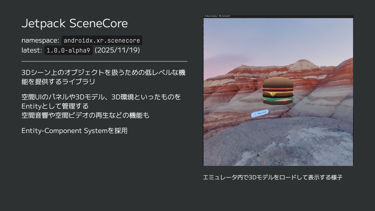 13. Jetpack SceneCore namespace: androidx.xr.scenecore latest: 1.0.0-alpha9 (2025/11/19) 3Dシーン上のオブジェクトを扱うための低レベルな機 能を提供するライブラリ 空間UIのパネルや3Dモデル、3D環境といったものを