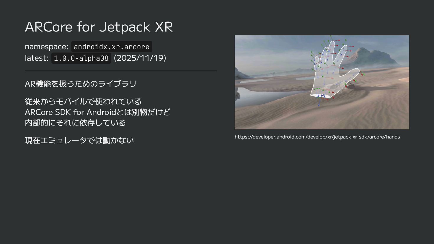 従来からモバイルで使われている ARCore SDK for Androidとは別物だけど 内部的にそれに依存している 現在エミュレータでは動かない https://developer.android.com/develop/xr/jetpack-xr-sdk/arcore/hands