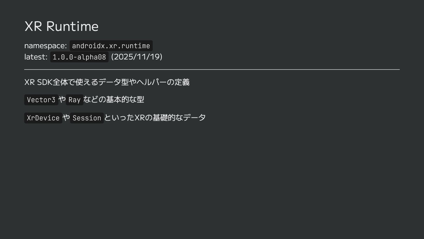 14. ARCore for Jetpack XR namespace: androidx.xr.arcore latest: 1.0.0-alpha08 (2025/11/19) AR機能を扱うためのライブラリ