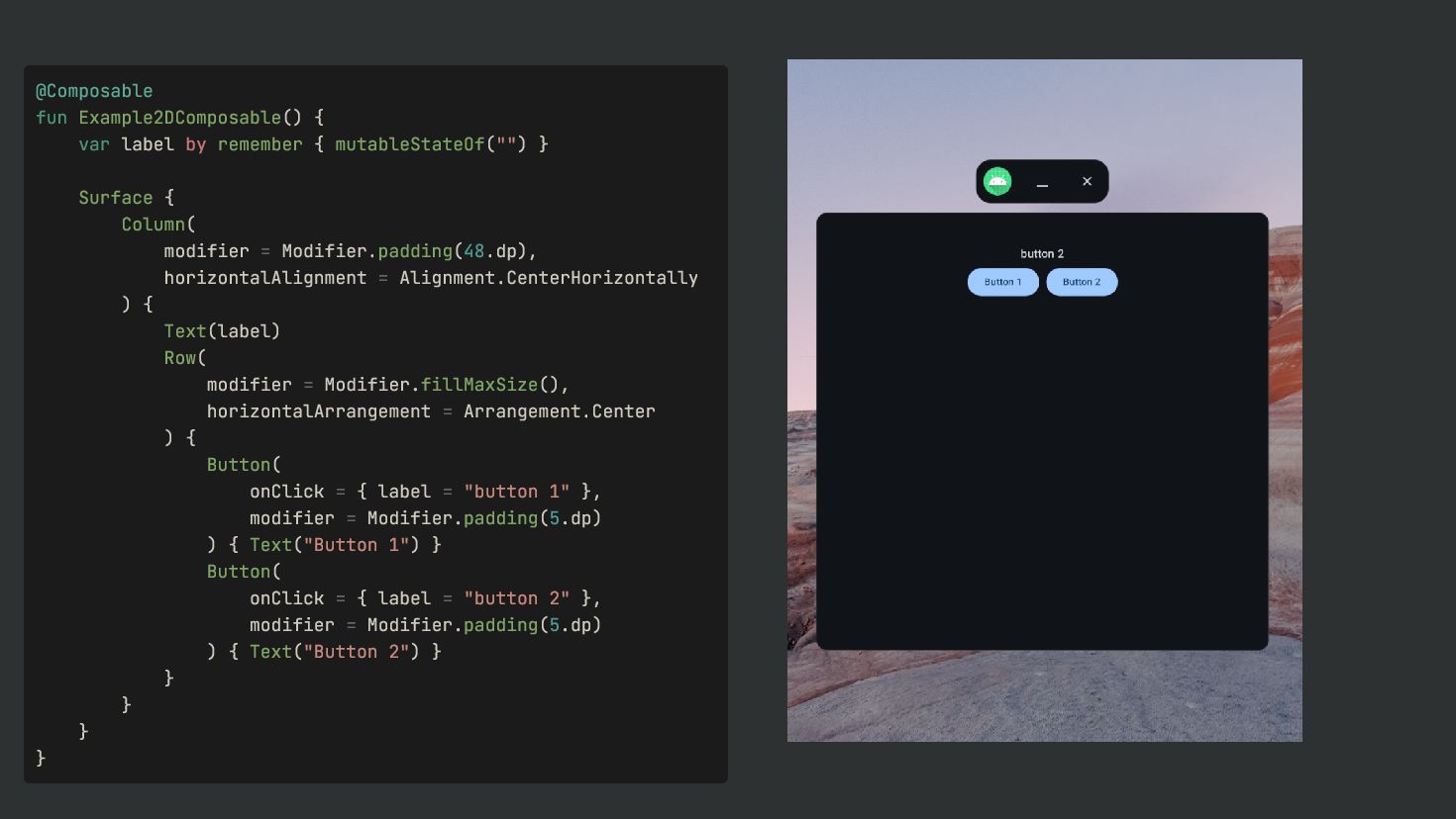 } Surface { Column( modifier = Modifier.padding(48.dp), horizontalAlignment = Alignment.CenterHorizontally ) { Text(label) Row( modifier = Modifier.fillMaxSize(), horizontalArrangement = Arrangement.Center ) { Button( onClick = { label = "button 1" }, modifier = Modifier.padding(5.dp) ) { Text("Button 1") } Button( onClick = { label = "button 2" }, modifier = Modifier.padding(5.dp) ) { Text("Button 2") } } } } }