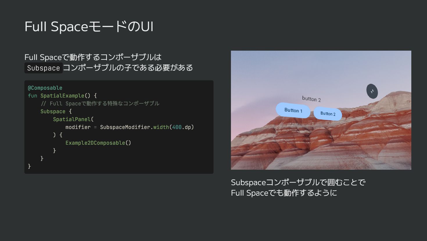 16. Full SpaceモードのUI Full Spaceで動作するコンポーザブルは Subspace コンポーザブルの子である必要がある Subspaceコンポーザブルで囲むことで Full Spaceでも動作するように @Composable