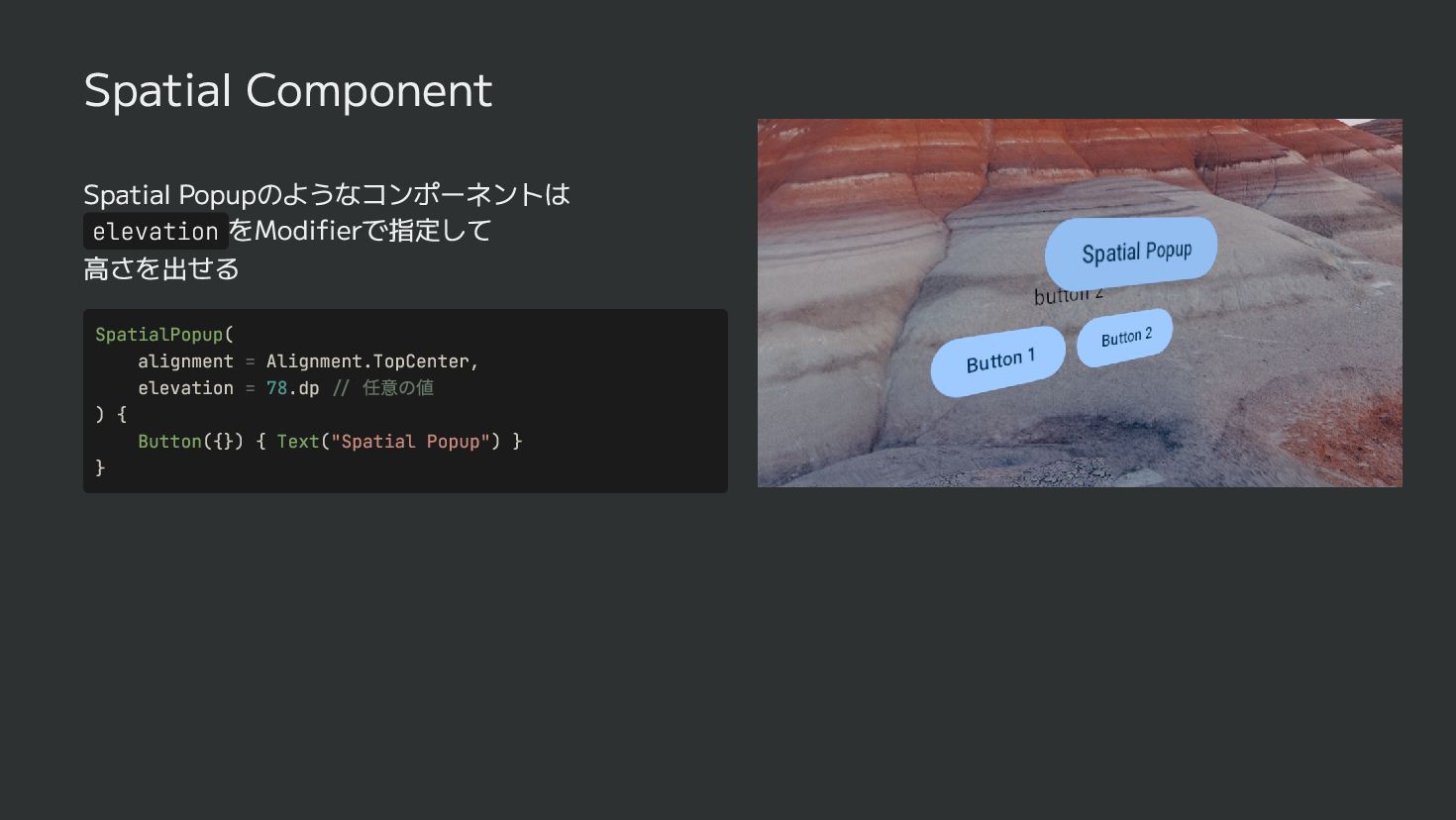 Alignment.TopCenter, elevation = 78.dp // 任意の値 ) { Button({}) { Text("Spatial Popup") } }
