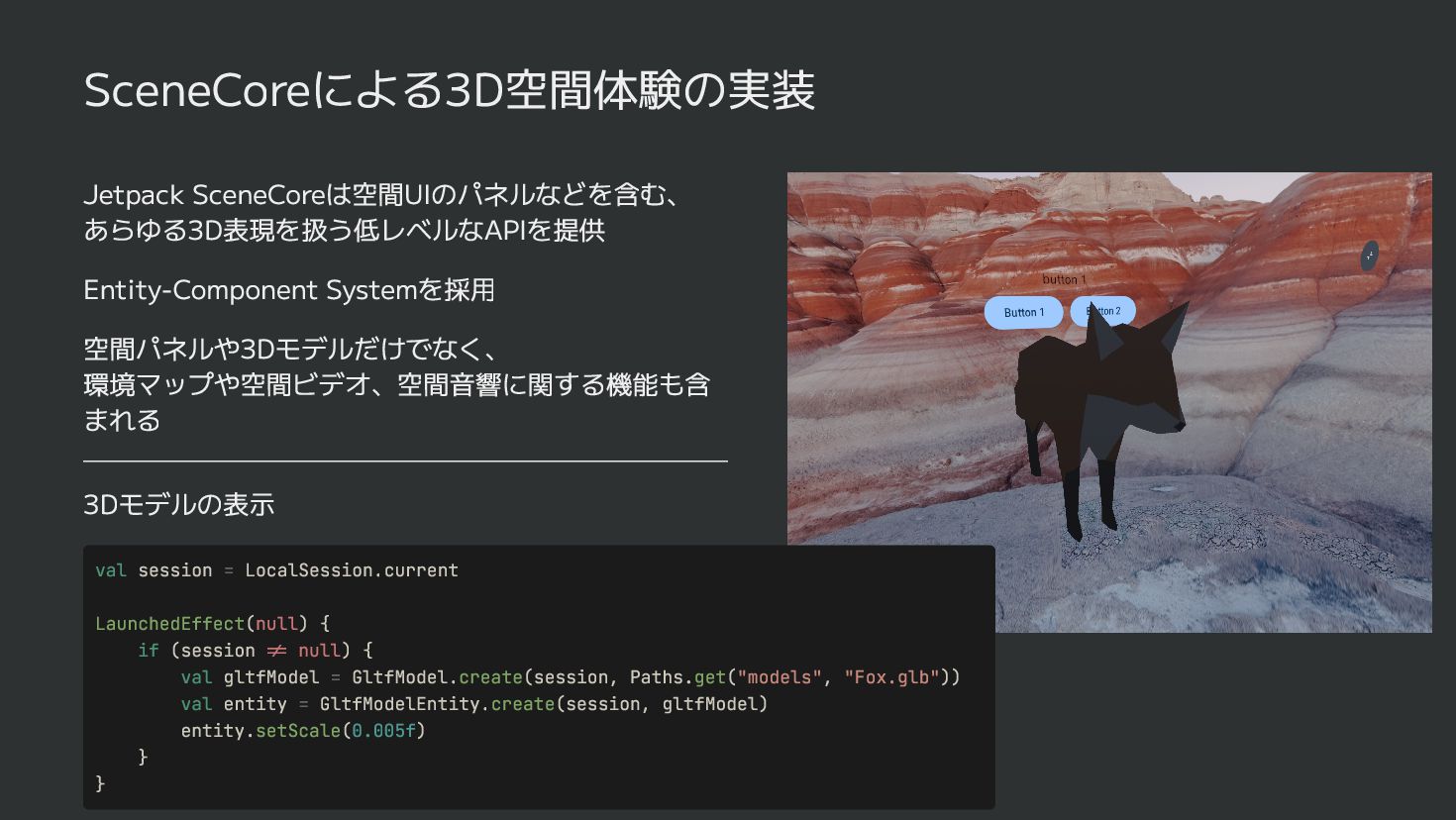 18. SceneCoreによる3D空間体験の実装 Jetpack SceneCoreは空間UIのパネルなどを含む、 あらゆる3D表現を扱う低レベルなAPIを提供 Entity-Component Systemを採用 空間パネルや3Dモデルだけでなく、 環境マップや空間ビデオ、空間音響に関する機能も含 まれる 3Dモデルの表示