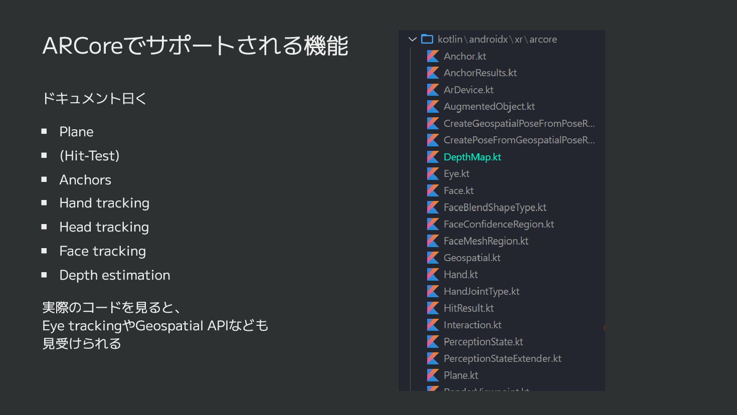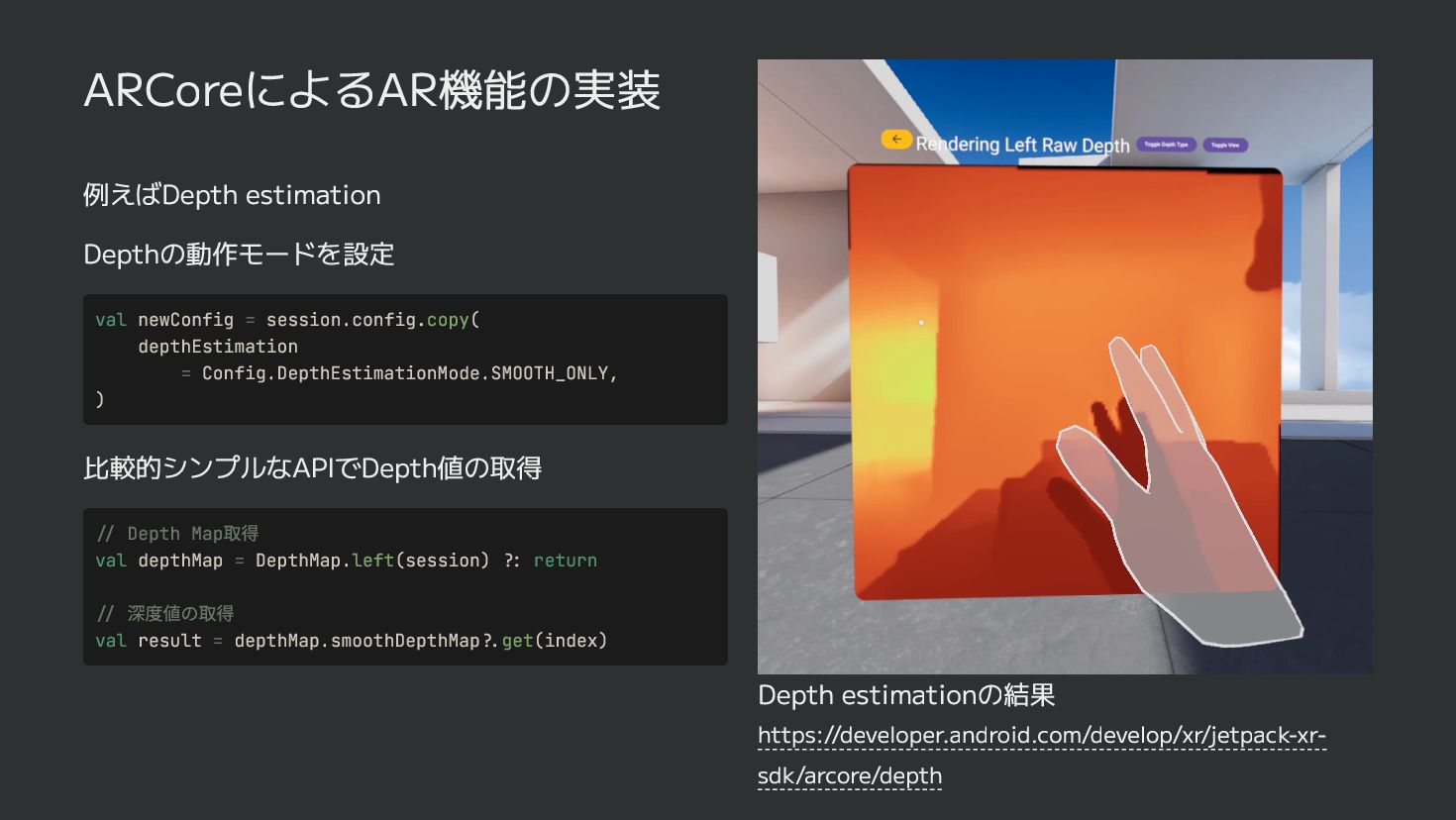 tracking Depth estimation 実際のコードを見ると、 Eye trackingやGeospatial APIなども 見受けられる