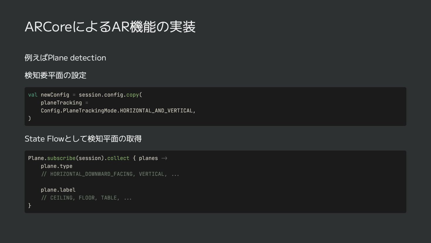 20. ARCoreによるAR機能の実装 例えばPlane detection 検知委平面の設定 State Flowとして検知平面の取得 val newConfig = session.config.copy(