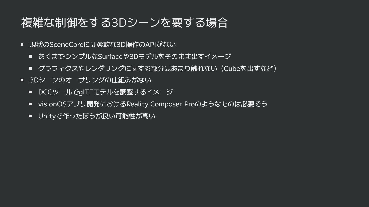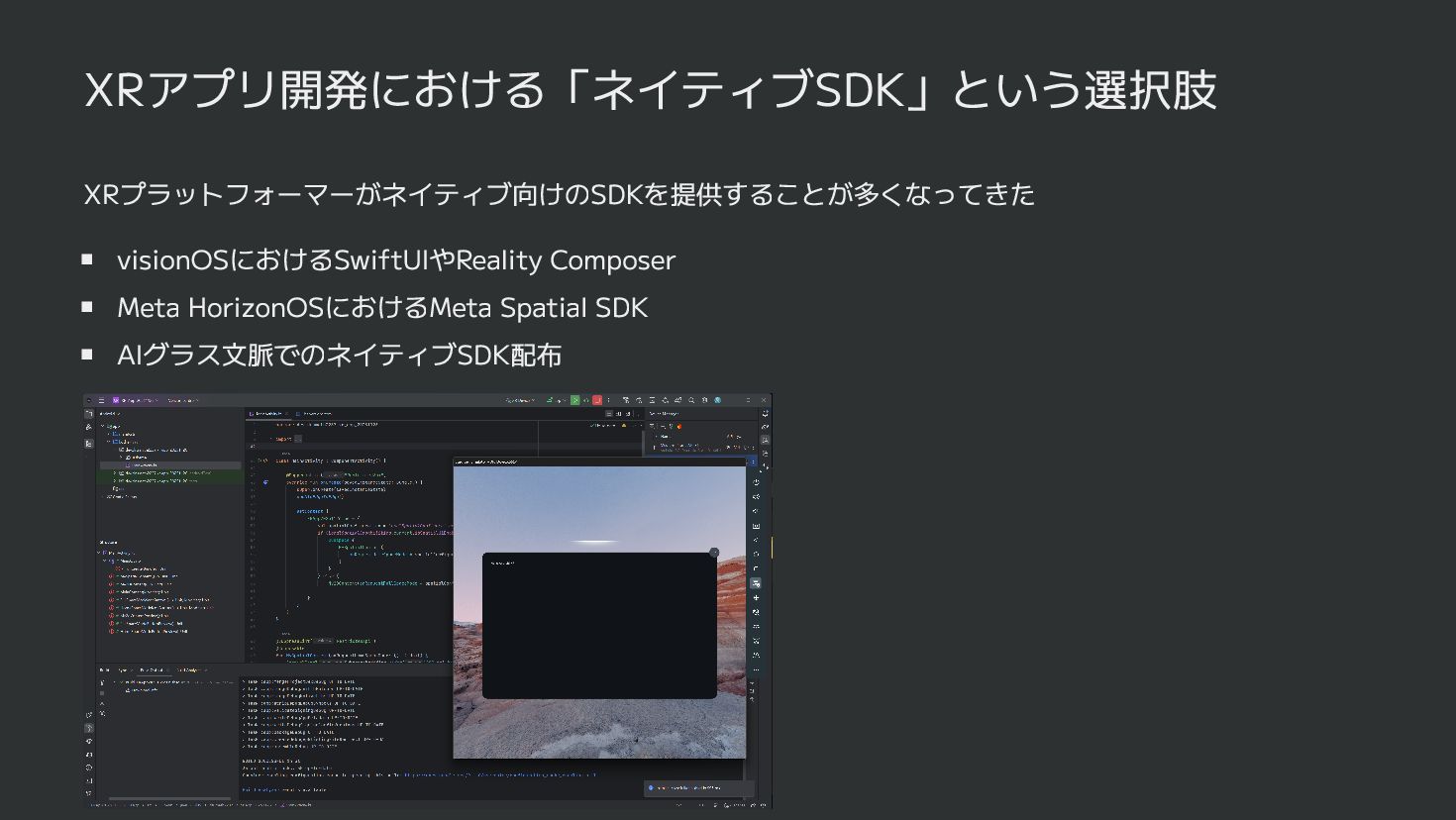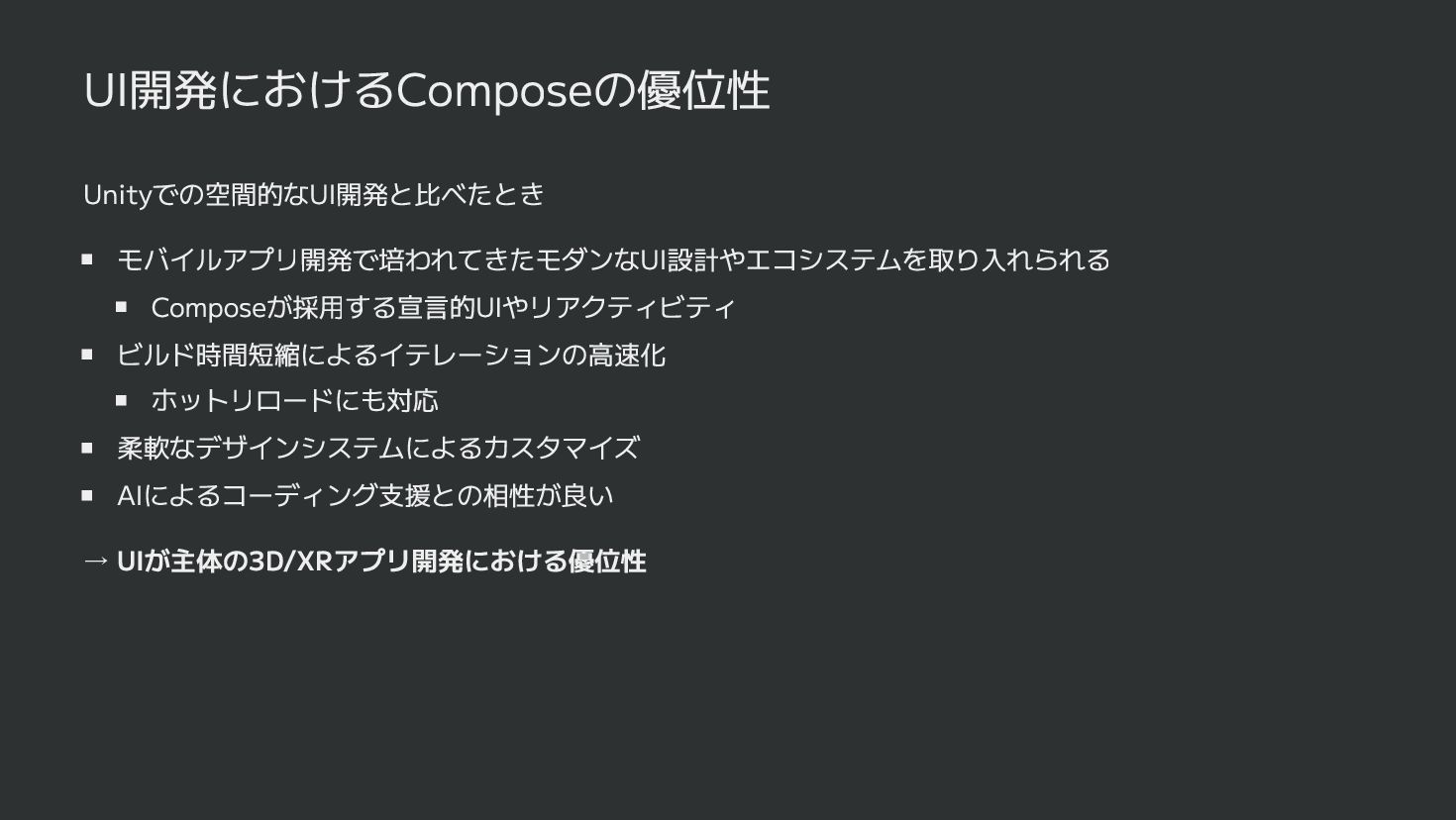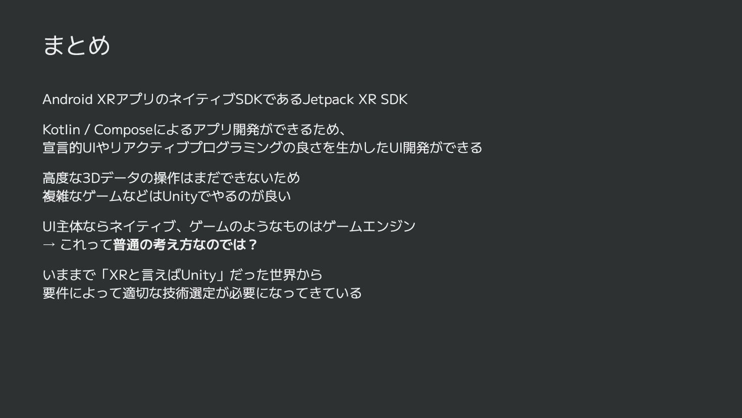 複雑なゲームなどはUnityでやるのが良い UI主体ならネイティブ、ゲームのようなものはゲームエンジン → これって普通の考え方なのでは? いままで「XRと言えばUnity」だった世界から 要件によって適切な技術選定が必要になってきている
