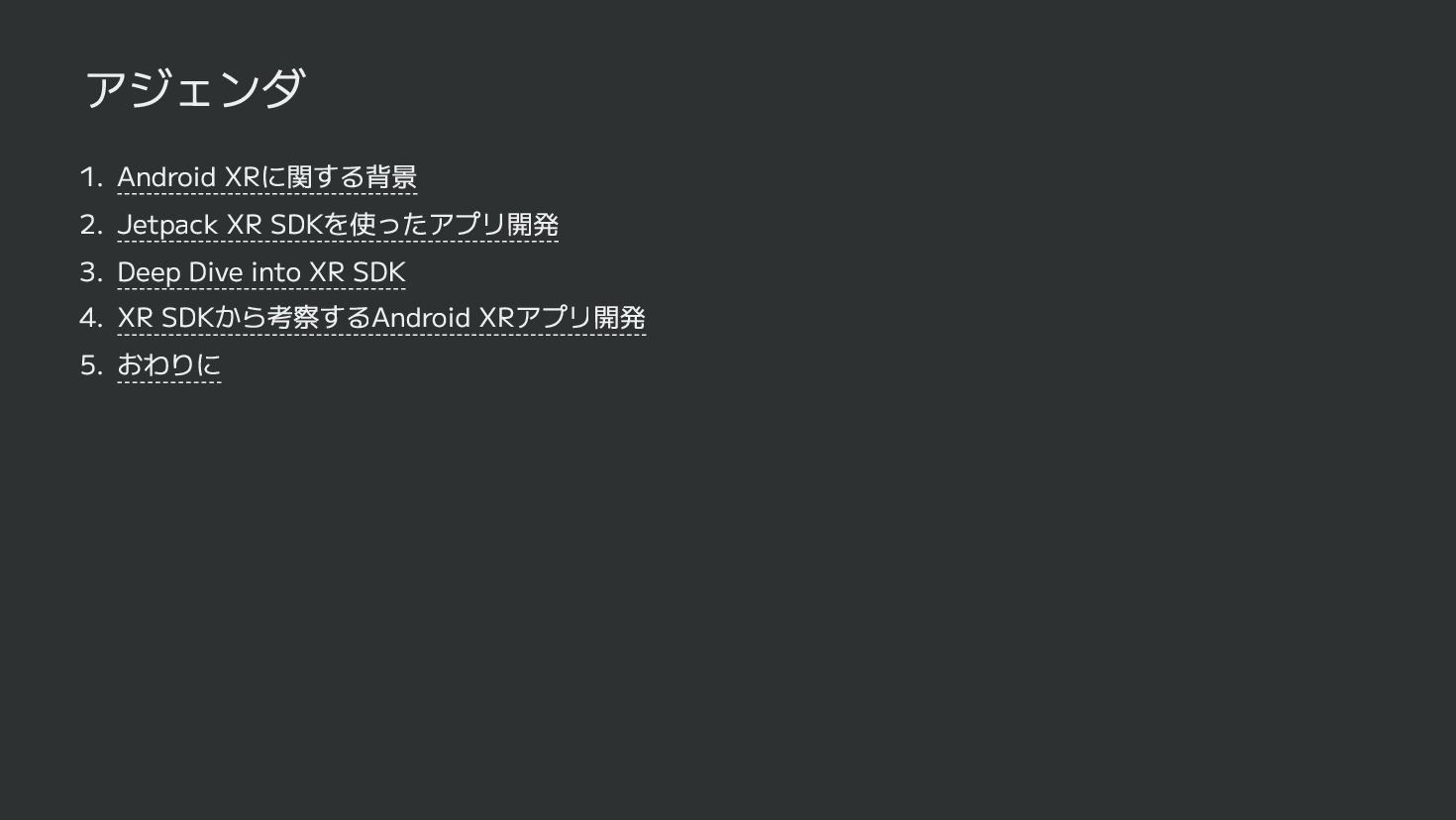 Dive into XR SDK 4. XR SDKから考察するAndroid XRアプリ開発 5. おわりに