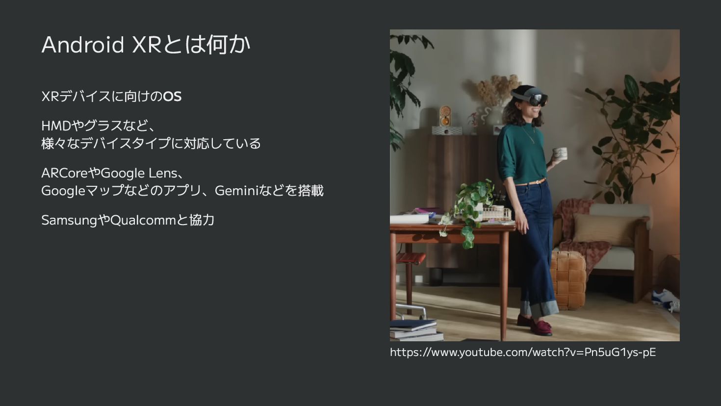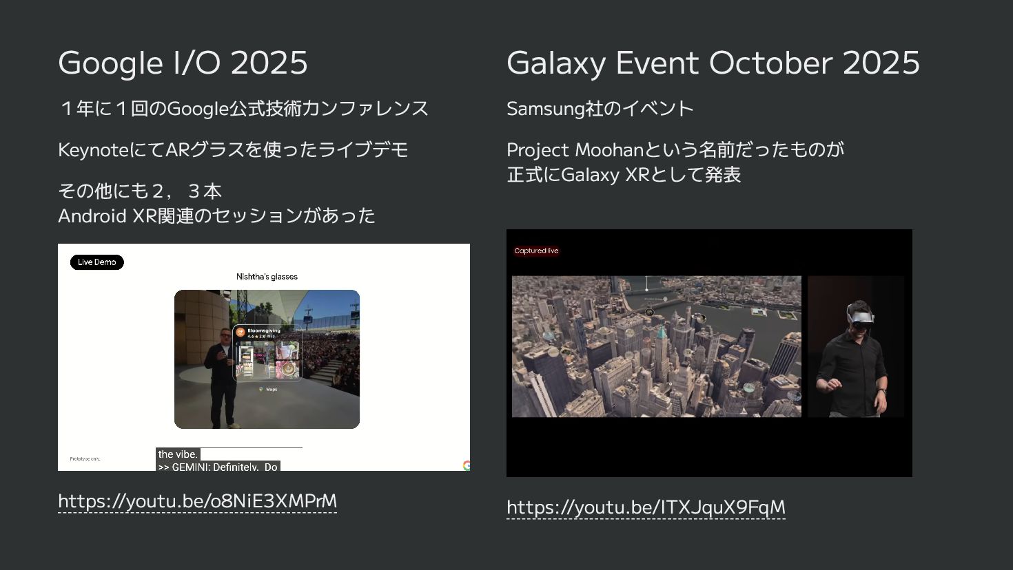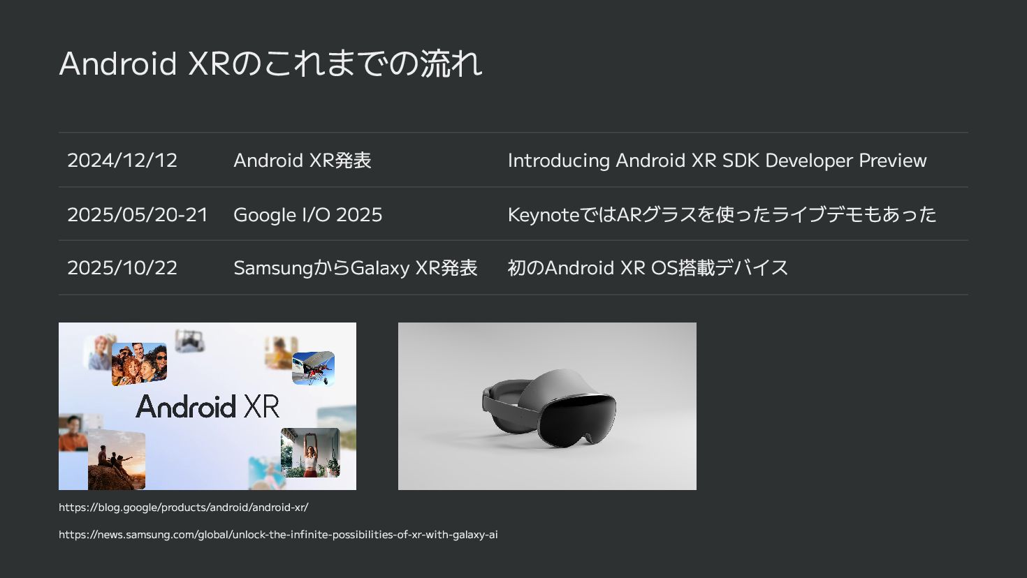 Preview 2025/05/20-21 Google I/O 2025 KeynoteではARグラスを使ったライブデモもあった 2025/10/22 SamsungからGalaxy XR発表 初のAndroid XR OS搭載デバイス https://blog.google/products/android/android-xr/ https://news.samsung.com/global/unlock-the-infinite-possibilities-of-xr-with-galaxy-ai