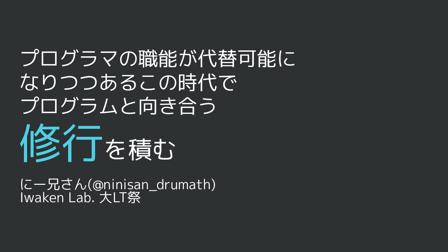 プログラマの職能が代替可能に なりつつあるこの時代で プログラムと向き合う 修行を積む にー兄さん(@ninisan_drumath) Iwaken Lab. 大LT祭
