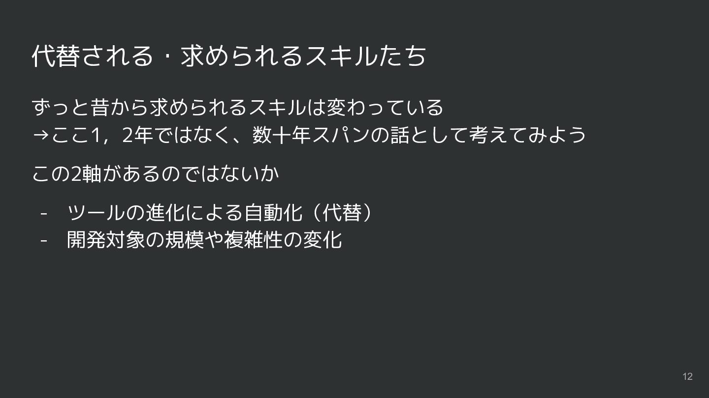 代替される・求められるスキルたち ずっと昔から求められるスキルは変わっている →ここ1,2年ではなく、数十年スパンの話として考えてみよう この2軸があるのではないか - ツールの進化による自動化(代替) - 開発対象の規模や複雑性の変化 12
