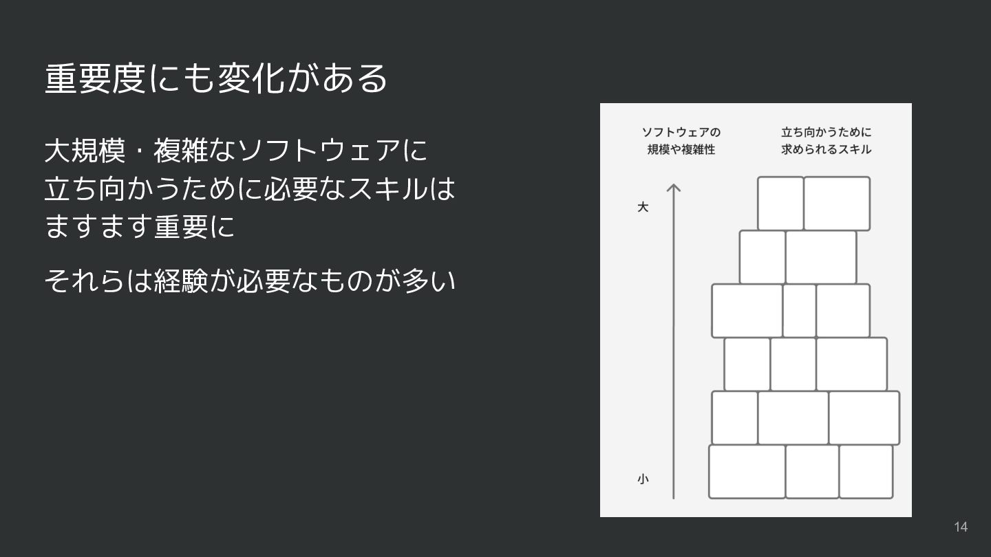 重要度にも変化がある 大規模・複雑なソフトウェアに 立ち向かうために必要なスキルは ますます重要に それらは経験が必要なものが多い 14
