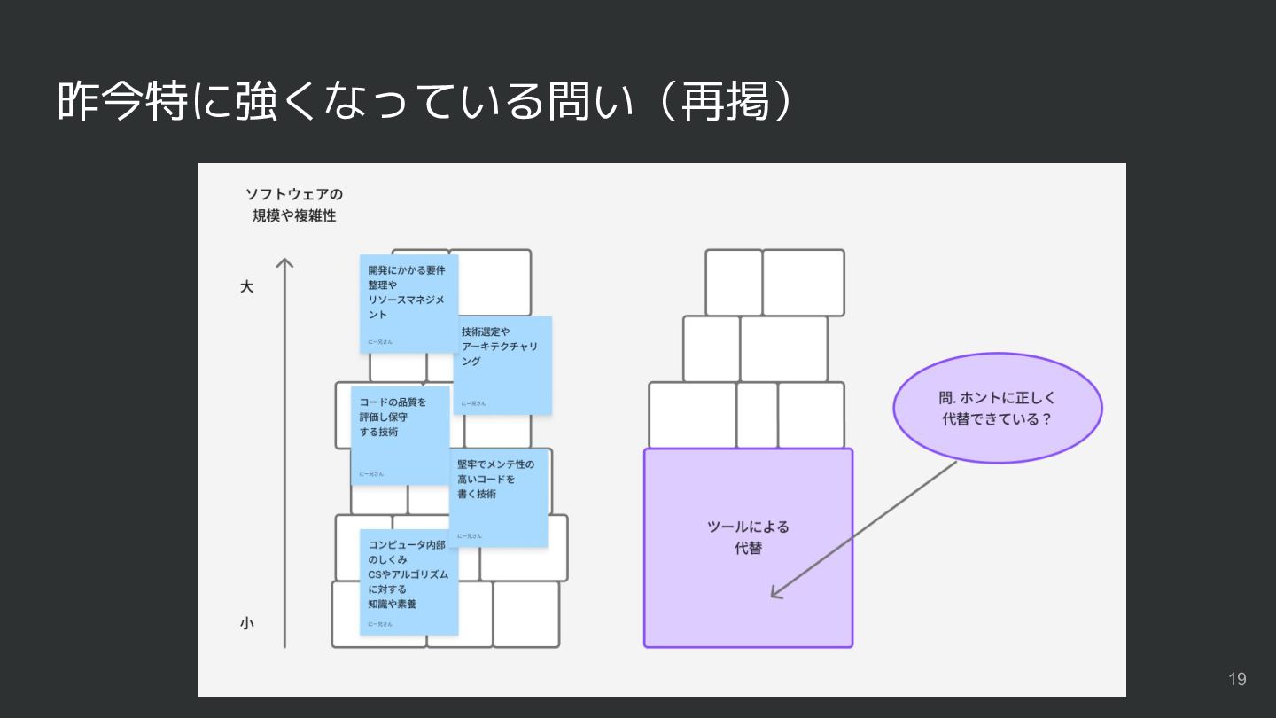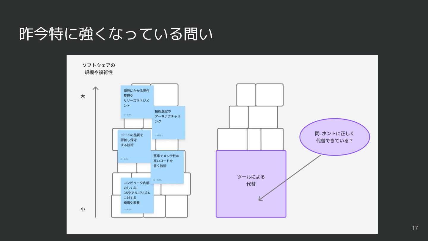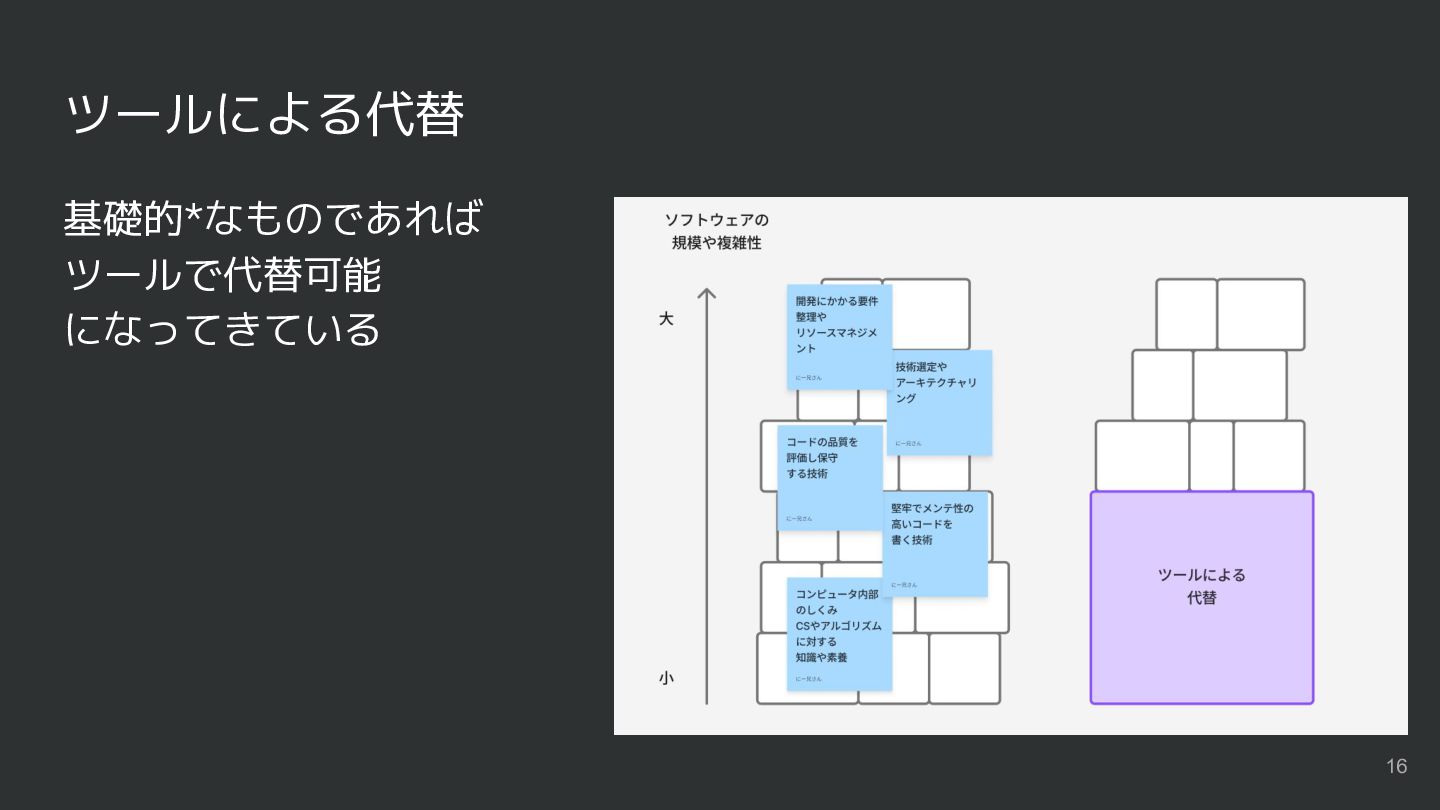 重要度にも変化がある 大規模・複雑なソフトウェアに 立ち向かうために必要なスキルは ますます重要に それらは経験が必要なものが多い 結局いつの時代も0から 積み上げる必要がある →年々習得が難しくなってく? 15