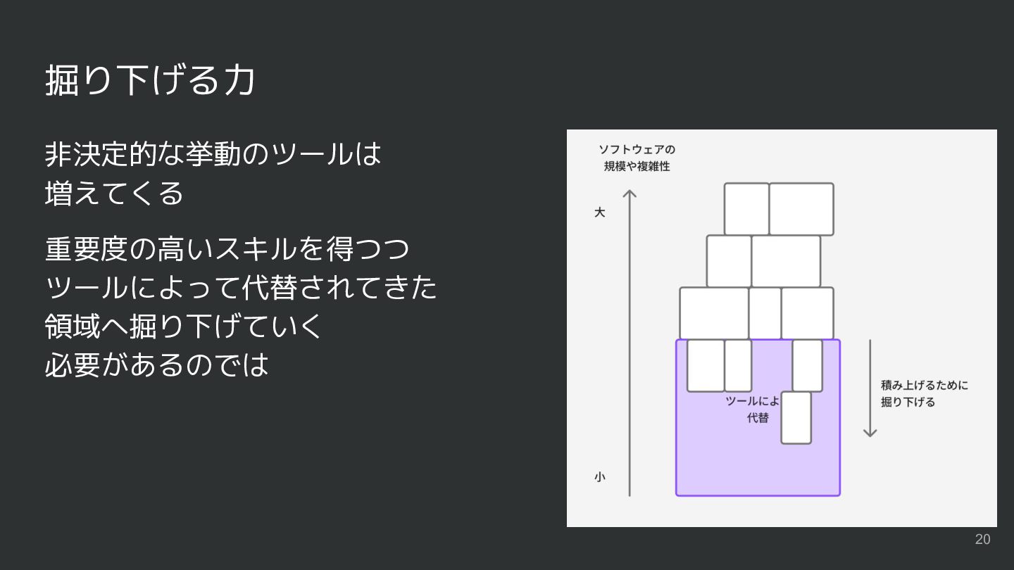 掘り下げる力 非決定的な挙動のツールは 増えてくる 重要度の高いスキルを得つつ ツールによって代替されてきた 領域へ掘り下げていく 必要があるのでは 20