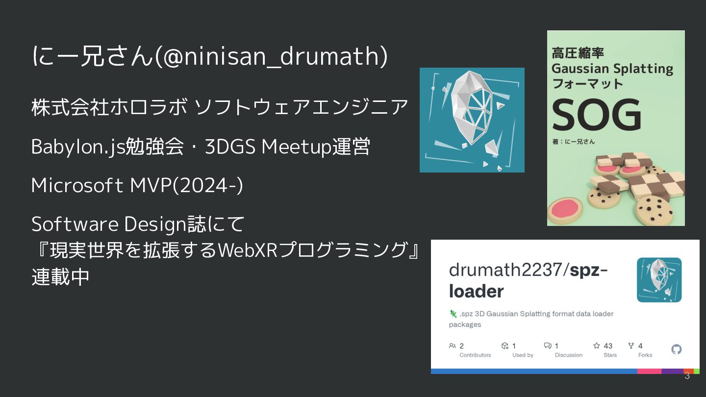 にー兄さん(@ninisan_drumath) 株式会社ホロラボ ソフトウェアエンジニア Babylon.js勉強会・3DGS Meetup運営 Microsoft MVP(2024-) Software Design誌にて 『現実世界を拡張するWebXRプログラミング』